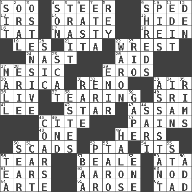 ACROSS 1. "Barney Miller" actor Jack 4. Bull 9. Hurried 13. Big collection agency 14. Speak pompously 15. Flintstone garb 16. Make lace 17. Thoroughly unpleasant 18. It's straight from the horse's mouth 19. French article 21. Call ___ day 22. Obtain by seizing forcibly or violently 24. Political cartoonist Thomas 26. Help 27. Of or pertaining to a meson 29. Greek god of love 30. N. Chile seaport 31. San ____ (Riviera town) 33. Atmosphere 36. 54 in ancient Rome 37. Pulling into pieces 40. Indian title of respect (Mr.) 41. Area sheltered from the wind 42. Play the lead 43. Indian state 45. Quote 47. Aches 48. Single 49. Possessive pronoun 50. Large numbers or amounts 52. Parent Teacher Assoc. 54. It is 56. Pull apart 57. Memphis, Tenn. Street 59. _ moment's notice (2 wds.) 61. Hearing organs 62. Composer Copland 63. Lower and raise head in agreement 64. Johnson of "Laugh-In" 65. Came up 66. Small amount or degree DOWN 1. Be seated 2. Spoken 3. Clearly or manifestly demonstrative 4. Boy, to dad 5. Distinguishing feature 6. 90 degrees 7. Singer James 8. Marina Del _, California 9. Fragments 10. Sliced desserts 11. Prepare for publication 12. Lair 20. Ketch in the Levant 22. Make _____ (do battle with) 23. _ de Janeiro 25. Scram, to a cat 27. Shopping center 28. 4th largest of the Great Lakes 29. Independent ruler or chieftain 31. Assign a rank or rating to 32. Period 33. Helper 34. SW Asia republic 35. Basketball hoops 38. _____ Park, CO 39. Yawn 44. Indian skirt 45. Rough 46. Indiana (abbr.) 49. Rings 50. Singe 51. Haul 52. Lightbulb-shaped fruit 53. Edible starchy tuberous root 55. Portico 56. Afternoon social gathering 57. Sound made by sheep 58. Compass dir. 60. Increase
