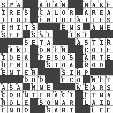 ACROSS 1. Health resort 4. First man 8. Cause to be 12. Angers 14. Bodily heat indicating an inflammation 16. Type of rug 17. Hoop that covers a wheel 18. Pleas 20. Gives off 22. Followers of ems 23. A saturated hydrocarbon 24. Observe 25. Fast jet (abbr.) 28. Mamie's mate 30. Stalk of a moss capsule 31. Being in motion 35. Leather borer 37. Presage 40. ____ d'Azur (French Riviera) 41. The content of cognition 42. Mexican monetary units 44. Johnson of "Laugh-In" 45. Undesirable depression on a surface 46. Portico 47. Friend of Pooh 48. Keyboard key 50. Simple or foolish person 52. Superhero pair 54. Environmental prefix 55. Fish or hair follower 58. White ___ sheet 61. Compass dir. 63. Puts on (as clothing) 65. Frustrate 70. Inactive volcano in Sicily 71. Hero or heavy, e.g. 72. Underwater navigation system 73. Put down 74. Inside; within (prefix) 75. Indian skirt 76. Area sheltered from the wind DOWN 1. Settings 2. First class 3. Nest on high 4. Adept person 5. One of the 12 tribes of Israel 6. The first octave above the treble staff 7. Greater amount 8. Floor protector 9. Operatic vocal solo 10. Peachy ____! 11. Relaxation 13. Arrange properly for use 15. Painter Guido (1575-1642) 19. "____ silly question..." 21. Compass dir. 26. Discontinue 27. Domesticates 29. Fortification 30. Scheduled 32. "Corrida" creature 33. "Tell ____ the Marines!" 34. Portuguese money of account (variant) 35. Arabian gulf 36. Left 38. Eastern Standard Time (abbr.) 39. Trap for birds or small mammals 41. Binary compound 43. Ketch in the Levant 49. Undersized animal 51. Cut the grass 53. Washington bills 55. Brizilian seaport 56. Bert's buddy 57. Sadhe (variant) 58. 43,560 square feet 59. Within a short period 60. Old (Scot.) 62. Greek god of love 64. Snakelike fish 66. Modern: prefix 67. Santa ___, CA 68. Automobile 69. Three (prefix)