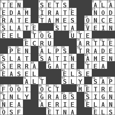 ACROSS 1. Nine, plus one 4. Arranges properly for use 8. In the manner of 11. Dutch treat 13. Feeling or showing extreme anger 15. Allow head to fall sleepily 16. Pace 17. Domesticates 18. Single time 19. Chalkboard 21. R.R. building 22. Distinctive style or manner 23. Snakelike fish 24. Coat; cloak 27. Shoshoni 29. Shade of tan 30. Nick name for Arthur 34. Fenced enclosure 36. High mountains 39. Barter 40. Narrow board 41. Smooth fabric 43. So be it 44. Father Junipero _ 46. Yard entry 47. Afternoon social gathering 48. Artist's stand 49. Otherwise 51. The first octave above the treble staff 53. Cunning 54. Plant excrement 57. One third of a yard 60. Sep. follower 63. Distance measurement (Brit.) 65. Inwardly 66. Catches 69. Public display of a written message 70. Teachers' org. 71. Nest on high 72. Style 73. Order of Saint Francis (abbr.) 74. Inactive volcano in Sicily 75. Raised railways DOWN 1. Laconic 2. Peak District village in England 3. Relating to or accompanying birth 4. Be seated 5. Epoch 6. Scottish caps 7. Proofreading order 8. Singer Murray 9. Event scenes 10. An important port of Yemen 12. Was introduced to 14. Son of Isaac 18. Make much ado about nothing 20. And so on (abbr.) 25. Mouths or openings 26. Russian prison camp 28. Make lace 29. Plea 31. Not wild 32. The content of cognition 33. Car or cant ending 34. Entreaty 35. Hearing organs 37. Parent Teacher Association (abbr.) 38. Locates 40. Compass dir. 42. 1994 drama film starring Jodie Foster 45. Everything 50. Symbol (abbr.) 52. Ancient Roman robe 54. Vertical member of a panel or frame 55. Therefore, facetiously 56. Actor Sean's family 57. Fine (Spanish) 58. Singles 59. Norwegian king 61. Algonquian 62. Small pie 64. Compass dir. 67. Storage container 68. Ocean