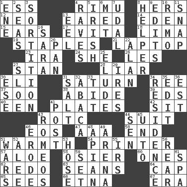 ACROSS 1. Curvy letter 4. Tall New Zealand timber tree 8. Possessive pronoun 12. Modern: prefix 13. Having ears or earlike features 14. Paradise 15. Hearing organs 17. Webber/Rice musical 18. Pale green bean 19. Paper fasteners 21. Portable computer 23. Lyricist Gershwin 24. A female animal or person 26. French article 27. Comedian Laurel of Laurel & Hardy 28. One who doesn't tell the truth 30. Connecticut Ivy Leaguer 31. Titan orbits this 34. To separate or throw off 37. "Barney Miller" actor Jack 38. Tolerate 39. Begley and Asner 40. Car or cant ending 41. Food holders 42. Be seated 43. College mil. group 44. Set of matching outer garments 46. Greek goddess of the dawn 47. Auto club (abbr.) 50. Conclusion 51. Heat 54. Hard copy producer 57. Medicinal plant 58. Flexible twig of a willow tree 60. Singles 62. Do over again 63. Actors Connery and Penn 64. Head covering 65. Observes 66. Inactive volcano in Sicily 67. Period DOWN 1. Compass dir. 2. Oceans 3. Determination 4. All-night dance parties 5. From or relating to Ireland 6. Was introduced to 7. Allodial 8. Assistant 9. Proofreads 10. San ____ (Riviera town) 11. Fastener 13. Snakelike fish 16. "Two Mules for Sister ____" 20. Baking dish 22. Actor Alda or Thicke 25. Evade 27. _ gin 29. Angers 30. Compass dir. 31. Table seasoning 32. Phillipine bananalike plant 33. Teat (slang) 34. Dwelling 35. Prepare for publication 36. Eastern Standard Time (abbr.) 41. Mail 43. Lover boys 44. Elected rep. 45. To (old English) 46. Wear away 48. Bee-related 49. Sports stadium 51. Armed conflicts 52. Toward shelter 53. Flexible conduit 55. Big collection agency 56. Tail end 59. Arrange properly for use 61. Health resort