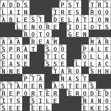 ACROSS 1. Sums up 5. Pacific Standard Time (abbr.) 8. Three (prefix) 11. (Had) reclined 12. Angers 13. Friend of Pooh 14. Most capable 17. Accusation by an informer 19. Poe poem 21. Foolish or stupid persons 22. Printing process, for short 23. Commissioned military rank (abbr.) 24. American Automobile Association (abbr.) 27. 480, 500 or 516 sheets of paper 29. Make imperfect 32. Small fatty European fish 34. "Barney Miller" actor Jack 36. Light colored 37. The Jewish people; Israel 38. Nervous spasm 39. Rounded earthenware pot or jar 40. Relaxation 41. Compass dir. 42. Pale purple color 43. Compass dir. 44. Pacific island yam 46. Quiet! 47. Parent Teacher Assoc. 50. Political cartoonist Thomas 52. A viewer who gazes fixedly 55. Michaelmas daisies 57. Newsperson 59. Eaten away 62. ___ a Wonderful Life 63. Drop; flow; fall 64. Billionth: prefix 65. Observe 66. Snakelike fish 67. Supplements with great effort DOWN 1. In the manner of 2. Apply (a substance) by light strokes 3. Deli pickle 4. Contemptuous expression 5. Before (prefix) 6. Former Milwaukee Brewers owner Bud 7. Sadhe (variant) 8. Musical group of three 9. Carrot, for example 10. Charged particles 12. Binary compound 15. Derisive sound 16. Carryall 18. Metal container 20. Cooks with dry heat, as in an oven 24. NE Netherlands city 25. Bee-related 26. Came up 28. Damp 29. Promenades 30. Assad's deity 31. Arrive at 33. One (Scot) 35. Seas 36. Luau course 42. Failure 45. Pace 47. Adept person 48. Laconic 49. Nick name for Arthur 51. Heavy duty weighing machine 52. Indian titles of respect 53. False hair 54. Domed church section 55. "We ___ not amused" (Victoria) 56. Neighbor of Neb. 58. Pipe bend 60. Compass dir. 61. Two (Sp.)