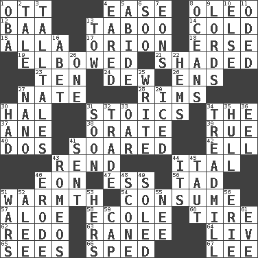 ACROSS 1. Baseball player Mel 4. Relaxation 8. Butter sub 12. Sound made by sheep 13. Off limits 14. Chilled 15. Silent film actress Nazimova 17. Constellation of myth 18. Celtic language 19. Shoved, as through a crowd 21. Cast a shadow over 23. "___ Little Indians" 24. Morning condensation 26. Followers of ems 27. Nathan's nickname 28. Basketball hoops 30. Actor Linden 31. Unemotional ones 34. Definite Article 37. One (Scot) 38. Speak pompously 39. Regret 40. Two (Sp.) 41. Flew 42. Pipe bend 43. Tear apart 44. Slanted text style (abbr.) 46. Period of immesurable duration 47. Double-curved letter 50. Bit 51. Heat 54. Ingest 57. Medicinal plant 58. Learning spot: Fr. 60. Become fatigued 62. Make new 63. Indian princess (variant) 64. 54 in ancient Rome 65. Perceives with the eye 66. Hurried 67. Area sheltered from the wind DOWN 1. Chief or king in Benin or Nigeria 2. Falsehood 3. Baron Munchausen's specialties 4. Having ears or earlike features 5. Stay 6. "Barney Miller" actor Jack 7. Immeasurably long periods of time 8. Seas 9. Titled peers of a realm 10. Otherwise 11. Wrote a lyric poem 13. Pull behind 16. Collude with 20. Single 22. Cloth borders 25. Compose 27. Billionth: prefix 29. On the rocks 30. Possessed 31. Within a short period 32. Barter 33. Boat paddle 34. Excercise machine 35. Frame or body of a ship 36. Snakelike fish 41. Posted 43. Lover boys 44. ___ a Wonderful Life 45. Drawn tight 46. Eat (away) 48. Biscuitlike quick bread 49. Having a sole or soles 51. Armed conflicts 52. Toward shelter 53. Possessive pronoun 55. Born 56. One of the Great Lakes 59. Head covering 61. Night before a holiday