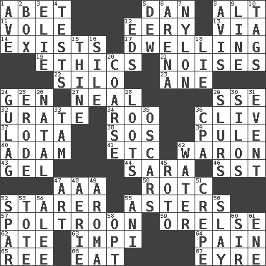 ACROSS 1. Collude with 5. Daniel's nick name 8. Keyboard modifier key 11. Grand slam 12. Suggestive of the supernatural 13. By way of 14. Is 17. Residence 19. Principles of right and wrong 21. Annoying sounds 22. Grain storage tower 23. One (Scot) 24. Commissioned mil. rank 27. Anneal 29. Compass dir. 32. A salt of uric acid 34. Friend of Pooh 36. 154 in Roman numerals 37. Globular water bottle used in Asia 38. Mayday 39. Whine 40. First man 41. And so on (abbr.) 42. Make _____ (do battle with) 43. Set 44. "Two Mules for Sister ____" 46. Fast jet (abbr.) 47. Auto club (abbr.) 50. College mil. group 52. A viewer who gazes fixedly 55. Michaelmas daisies 57. Coward 59. Threatening words 62. Had dinner 63. Body of Kaffir warriors 64. Ache 65. To sift 66. Erode 67. Jane of fiction DOWN 1. "___ Maria" 2. Gift holder 3. Writer Wiesel 4. Trials 5. Morning condensation 6. Sports stadium 7. Thermoplastic polyamide 8. Opinion 9. Actor's bit 10. Labels 12. Begley and Asner 15. One or ones belonging to thee 16. Filth; sediment 18. Whopper 20. Unrefined 24. Russian prison camp 25. Eat (away) 26. Relating to or accompanying birth 28. Plunders 29. Disparaging remarks 30. Grain storage towers 31. Incident 33. Scottish cap 35. Motion picture awards 36. Accounting whiz (abbr.) 42. Wetness 45. Printing process, for short 47. Nonscientific branch of learning 48. Nest on high 49. Odor 51. Streamer paper 52. Coast Guard woman 53. Carry 54. Toward shelter 55. Black tropical American cuckoo 56. Kill 58. Elect 60. Title for a knight 61. Compass dir.