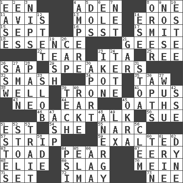 ACROSS 1. Car or cant ending 4. An important port of Yemen 8. Single 11. Opinion 13. Undercover agent 14. Greek god of love 15. Back-to-school mo. 16. Inconspicuous attention getter 17. Stricken, poetically 18. Gist 21. Honkers 22. Separate forcefully 23. Call ___ day 25. Portuguese money of account (variant) 26. Plant excrement 29. Orators 32. Box-office sellout 34. Cooking vessel 35. The 23rd letter of the Hebrew alphabet 38. Not ill 39. Marketplace scale 41. Musical composition 43. Modern: prefix 44. Ewer handle 45. Profane or obscene expressions 46. Sass 50. Institute legal proceedings 51. Eastern Standard Time (abbr.) 54. A female animal or person 55. Drug cop 57. Long narrow piece of something 59. Glorified 63. Frog relative 64. Lightbulb-shaped fruit 67. Suggestive of the supernatural 68. Writer Wiesel 69. Volcanic refuse 70. Count _ (2 wds.) 71. Arrange properly for use 72. "If ____ say so..." 73. Born DOWN 1. Relaxation 2. Nights before holidays 3. Cuts off 4. Electrical Unit 5. Two (Sp.) 6. Raised railways 7. Fish or hair follower 8. Abalone 9. Annoying sound 10. First name in cosmetics 12. Proofreading order 14. Compass dir. 19. Delicate 20. Head covering 21. Slender fish 23. Image 24. Wig 26. Compass dir. 27. So be it 28. Light colored 30. To the left, to Queeg 31. Portico 33. Messy guy 36. Flats, for short 37. Chinese city south-southwest of Nanjing 39. Technical 40. Immoral or dissolute person 42. Compass dir. 45. Gumbo ingredient 47. Cleo's killer 48. Disorder of the immune system 49. Not strict 51. _____ Park, CO 52. Took without asking 53. Distinguishing feature 56. Clement's nick name 58. Binary compound 60. Adolescent 61. 4th largest of the Great Lakes 62. Unit of force 64. Air pressure measure (abbr.) 65. Shade tree 66. American Automobile Association (abbr.)