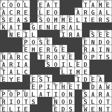 ACROSS 1. Calm and collected 5. Ingest 8. Docile 12. Measure of real estate 13. Lion 14. Therefore, facetiously 15. Oceans 16. Wine waiters 19. Krazy ___ of comics 20. Commissioned military rank 21. Famous astronaut Armstrong 23. Lyricist Gershwin 24. Perceive with the eye 27. Airs 30. Inside; within (prefix) 31. Develop 34. Precipitation 35. Drug cop 38. Collection of objects 40. Chooses 41. Roberta Peters solo 42. Dirtied 44. Baby powder 45. Citrus frut 46. Sight organ 47. Eastern Standard Time (abbr.) 50. The main thing one is thinking about 53. Curse 57. Simpleton 59. Census information 63. "Two Mules for Sister ____" 64. Disturbances 65. Dreamland 66. Narrow, elongated depression 67. Writer Wiesel 68. Begley and Asner 69. Gone DOWN 1. Keg 2. Sea 3. Declaim 4. French article 5. Otherwise 6. A really long time 7. Heavy book 8. Three (prefix) 9. Ripen 10. Make imperfect 11. Raised railways 14. Silent film actress Nazimova 17. Medical imaging device (abbr.) 18. Ewer handle 20. Seize upon or latch onto something 22. Medicinal drug used to evoke vomiting 24. Fastener 25. Prepare for publication 26. Immeasurably long periods of time 28. Put into a specified state 29. Blunders 30. Worn away 32. Thick or sticky substance 33. Tending to cause great harm 35. Nathan's nickname 36. Like ___ of sunshine 37. Cause heat under the collar 39. Biblical high priest 43. Give off 47. Snakelike fish 48. Health resort 49. Teat (slang) 51. Peak District village in England 52. Composer Copland 54. Prong on a fork 55. Parka part 56. Conclusions 58. Electrical Unit 59. Before (prefix) 60. Lubricate 61. Luau course 62. Shoshoni 63. Compass dir.