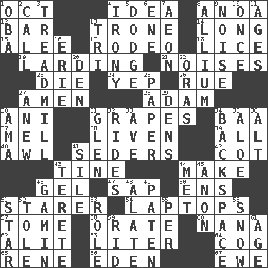 ACROSS 1. Sep. follower 4. The main thing one is thinking about 8. Small Philippine buffalo 12. Long, evenly shaped piece 13. Marketplace scale 14. Yearn 15. Toward shelter 17. Cowboy competition 18. Louse (plural) 19. Preparing or cooking with lard 21. Annoying sounds 23. Pass on 24. Slangy assent 26. Regret 27. So be it 28. First of billions? 30. Black tropical American cuckoo 31. Raisin fruits 34. Sound made by sheep 37. Cartoonist voice _ Blanc 38. Make or become more lively 39. 100% 40. Leather borer 41. Spring feasts 42. Small bed 43. Prong on a fork 44. Create 46. Set 47. Plant excrement 50. Followers of ems 51. A viewer who gazes fixedly 54. Portable computers 57. Heavy book 58. Speak pompously 60. Nanny 62. Set down 63. 61 cubic inches 64. Gear tooth 65. French philosopher Descartes 66. Paradise 67. She-sheep DOWN 1. Chief or king in Benin or Nigeria 2. Give a ring to 3. Excercise machine 4. Literary sarcasm 5. Evade 6. Compass dir. 7. Period of immesurable duration 8. Plant genus of onion and garlic 9. Annoying sound 10. Single time 11. Eras 13. Three (prefix) 16. One of the Great Lakes 20. Lair 22. Mouths or openings 25. Some stationery 27. Afresh 29. Lairs 30. Nursemaid (var.) 31. Small, secluded valley 32. Amusement-park features 33. "___ Maria" 34. Keyboard key 35. Medicinal plant 36. The first octave above the treble staff 41. Drop; flow; fall 43. Cylindrical with tapered ends 44. Was introduced to 45. Soon (poet.) 46. Street urchin 48. Having winglike extensions 49. Eucharist need 51. Play the lead 52. Lacquered or enameled metalware 53. Hero or heavy, e.g. 55. For each 56. Overwhelm 59. To free from 61. Grow older