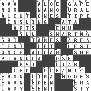 ACROSS 1. Actress Gardner 4. Medicinal plant 8. Open wide 12. Not either 13. Billionth: prefix 14. Mountain range 15. Native American of Southwest Alaska 18. Singles 19. Native american tent (variation) 20. Following as a consequence or result 22. "One Day ___ Time" 23. Tenement units (abbr.) 24. Australian flightless bird 25. Player for Phoenix 26. Catching in a trap 30. Indian title of respect (Mr.) 33. Corrects by punishment or discipline 36. Type of rug 37. Portable shelter 39. Allow 40. For fear that 41. At one time in the past 42. Assad's deity 44. A female animal or person 45. Player piano 47. Order of Saint Francis (abbr.) 50. Pacific Standard Time (abbr.) 51. One who doesn't tell the truth 53. Corporate head (abbr.) 54. Pertaining to the sea 57. Inky black, to poets 59. Pale green bean 61. Methods 63. Merit 64. Paradise 65. Epoch 66. Kenny Rogers chart-topper in '80 67. Posted 68. Filthy place DOWN 1. Santa ___, CA 2. Grand slam 3. Sports stadium 4. Soon (poet.) 5. Austrian-born American filmmaker Fritz 6. Single 7. Greek goddess of the dawn 8. From the throat 9. Operatic vocal solo 10. Infant food 11. Biblical high priest 16. United States Postal Service (abbr.) 17. Ballerina skirt 21. Is not 22. Nursemaid (var.) 24. Followers of ems 26. Stalk of a moss capsule 27. Angers 28. Delicate 29. Yard entry 30. Cease 31. Painter Guido (1575-1642) 32. South American Indian 34. Silent film actress Nazimova 35. Cartoonist voice _ Blanc 38. 3-inch nail 42. Keyboard modifier key 43. Hollow 46. Bear (Spanish) 48. Thailand, formerly 49. Papal veil 52. Amusement-park features 53. Drawstring 54. Presage 55. Patter 56. An absolute certainty 57. Snakelike fish 58. Sound made by sheep 59. French article 60. Binary compound 62. Declare