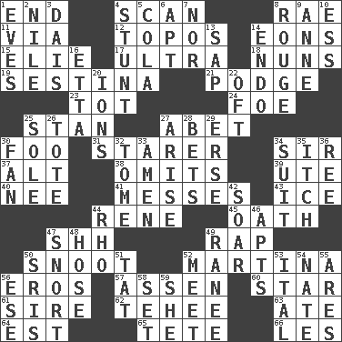 ACROSS 1. Conclude 4. Examine minutely or intensely 8. Actress Charlotte 11. By way of 12. Literary convention 14. Immeasurably long periods of time 15. Writer Wiesel 17. Extreme 18. Religious women 19. French poetic form 21. Porridge 23. Small child 24. Enemy 25. Comedian Laurel of Laurel & Hardy 27. Collude with 30. Egg _ yung 31. A viewer who gazes fixedly 34. Title for a knight 37. Keyboard modifier key 38. Leaves out 39. Shoshoni 40. Born 41. Makes clutter 43. Frozen water 44. French philosopher Descartes 45. Pledge 47. Quiet! 49. Strike 50. Snout, nose 52. Chrissie's court nemesis 56. Greek god of love 57. NE Netherlands city 60. Play the lead 61. Beget 62. Giggle 63. Had dinner 64. Eastern Standard Time (abbr.) 65. Wig 66. French article DOWN 1. Nights before holidays 2. Mediterranean tributary 3. Raised platform 4. Difficult or unusual or dangerous feat 5. Root beer relative 6. Fitting 7. And not 8. Makeup applied to the cheeks 9. Queen of England 1702-14 10. Curvy letter 13. Plant excrement 14. Inside; within (prefix) 16. Singer James 20. Charged particles 22. Often (poetically) 25. Not divided or shared with others 26. Lug 27. Ascend 28. Stakes 29. Celtic language 30. Air blower 32. Heavy book 33. So be it 34. Costume for a special activity 35. Hankering 36. To riddle 42. Fly high 44. 17th letter of the Greek alphabet 46. Tenement units (abbr.) 47. Derisive sound 48. Flexible conduit 49. The wife of a rajah (variant) 50. Indian titles of respect 51. Make lace 52. Confront 53. Slanted text style (abbr.) 54. Nathan's nickname 55. Ancient Greek god of war 56. Compass dir. 58. Put into a specified state 59. A female animal or person