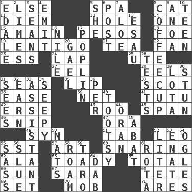 ACROSS 1. Otherwise 5. Health resort 8. Feline 11. South Vietnam president (1954) 12. Opening into or through something 14. Single 15. At full speed 17. Mexican monetary units 18. Enemy 19. Small, flat, pigmented spot on the skin 21. Beverage made from leaves 22. Air blower 23. Double-curved letter 24. Infant locale 25. Shoshoni 27. Snakelike fish 28. Snakelike fish 31. Oceans 35. Mouth edge 37. Native of Scotland 38. Comfort 39. Fish or hair follower 41. Ballerina skirt 42. Celtic language 43. Friend of Pooh 45. Connect, as a bridge 46. Clip 47. Mouth or opening 49. Symbol (abbr.) 51. Keyboard key 52. Lion 55. Fast jet (abbr.) 57. Tate display 60. Catching in a trap 62. According to 63. Sycophant 65. Add up to 66. Player for Phoenix 67. "Two Mules for Sister ____" 68. False hair 69. Arrange properly for use 70. Crowd into 71. Ancient Greek god of war DOWN 1. Peak District village in England 2. Citrus fruits 3. Seines 4. Send forth 5. A female animal or person 6. Mail 7. _ vera 8. Java holder (2 wds.) 9. Small Philippine buffalo 10. Adolescent 13. Son of Isaac 16. The longest river in the world 17. Cotton for raincoats, e.g. 20. Highlander 26. Trials 29. Globular water bottle used in Asia 30. Surprise greatly 31. Observes 32. Merit 33. Aide 34. Oozy 36. For each 40. A girl or young woman (variant) 44. NW Algerian seaport 48. Blind as ____ 50. Floor coverings 52. 61 cubic inches 53. Related on the mother's side 54. Stares 55. Backtalk 56. Turn sharply 58. Wander aimlessly 59. Edible starchy tuberous root 61. Round or rotation of duties 64. Small moist lump or mass