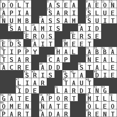 ACROSS 1. Dunce 5. Toward the sea 9. A really long time 13. Capital of Western Samoa 14. Indian skirt 15. Turn sharply 16. Unfeeling 17. Indian state 18. Set or collection 19. Deli grouping 21. Help 22. Greek god of love 23. Celtic language 24. Begley and Asner 27. Small island 28. Rendezvous 29. Likely to tip or tilt 31. Actor Linden 32. Swedish rock group 36. Russian ruler of old 37. Head covering 38. Be tempered by heat 39. Land measure 40. Increase 41. Having lost freshness 42. Indian titles of respect 44. R.R. building 46. Pass on 47. One who doesn't tell the truth 48. Tense 50. Binary compound 51. Preparing or cooking with lard 54. Yard entry 56. To the left, to Queeg 58. Place where flour is made 60. Presage 61. Nathan's nickname 62. Margarine 63. Piece 64. The sixth month of the Jewish calendar 65. Monthly bill DOWN 1. Daniel's nick name 2. Musical composition 3. Pale green bean 4. Eating place 5. Help 6. Backtalk 7. Epoch 8. Direct toward a target or goal 9. Aide 10. Evade 11. Fr. "Yes" 12. Remaining after all deductions 17. Mine, in Marseilles 20. Like ___ of sunshine 21. "We ___ not amused" (Victoria) 23. Snakelike fish 24. Singer James 25. Flat circle 26. Practice fight 28. Atlas unit 30. Elected leader of a country 31. Possessed 33. Necklace unit 34. Indonesian resort city 35. Toward shelter 37. Music discs 40. Wind 41. Saudi Arabian king (1953-1964) 43. Actress Charlotte 44. A viewer who gazes fixedly 45. Small pie 47. 61 cubic inches 49. Southeast Indonesia island 51. Globular water bottle used in Asia 52. "Death on the ____" 53. Small, secluded valley 54. Republican Party 55. Housemaid (var.) 56. Santa ___, CA 57. Groovy apt. 59. Car dealer's back yard