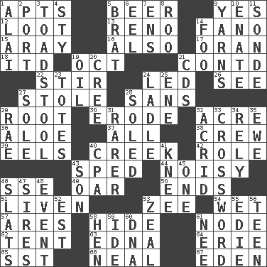 ACROSS 1. Tenement units (abbr.) 5. Fermented drink made from hops 9. Affirmative reply 12. Spoils 13. Former U.S. Attorney General Janet 14. Papal veil 15. Like ___ of sunshine 16. In addition 17. NW Algerian seaport 18. It would 19. Sep. follower 21. Continued (abbr.) 22. Tumult 24. Directed 26. Perceive with the eye 27. Fur scarf 28. Without 29. Carrot, for example 30. Eat (away) 32. Measure of real estate 36. Medicinal plant 37. Everything 38. Ship's personnel 39. Snakelike fish 40. Small stream 42. Hero or heavy, e.g. 43. Drove too fast 44. Annoyingly loud 46. Compass dir. 49. Boat paddle 50. Extremities 51. Make or become more lively 53. Last letter of the English alphabet 54. Dripping 57. Ancient Greek god of war 58. Flintstone garb 61. Thickened enlargement 62. Portable shelter 63. Pulitzer Prize-winning author Ferber 64. 4th largest of the Great Lakes 65. Fast jet (abbr.) 66. Anneal 67. Paradise DOWN 1. Jai ____ 2. Left side of a ship or aircraft 3. Inedible or poisonous agaric 4. Filthy place 5. Naughty child 6. Snakelike fish 7. Followers of ems 8. Friend of Pooh 9. Tall tales 10. Related on the mother's side 11. Something which is sent 14. Egg _ yung 19. Lubricate 20. Algonquian 21. Music discs 23. Lugs 24. Dipping utensil 25. Compass dir. 27. Flatfish 28. Having a sole or soles 29. Actress Charlotte 31. More valued for its uncommonness 32. Bitter 33. What you're doing now 34. Have confidence or faith in 35. She-sheep 40. Tax preparer (abbr.) 41. Leg joint 43. Male child 45. Single 46. Narrow boards 47. Founders of families 48. Incident 52. Eastern Standard Time (abbr.) 53. Ardor 55. Singer Brickell 56. Adolescent 58. Layer 59. Binary compound 60. Heredity factor (abbr.) 61. Born