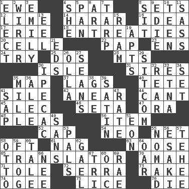 ACROSS 1. She-sheep 4. Petty quarrel 8. Puts into a specified state 12. Citrus frut 14. Ethiopian city, capital of Harari 16. The main thing one is thinking about 17. One of the Great Lakes 18. Pleas 20. Cell (Danish) 22. Infant food 23. Followers of ems 24. Attempt to accomplish something 25. Two (Sp.) 28. Mountains (abbr.) 30. Small island 31. Founders of families 35. Atlas unit 37. Fails to keep up a pace 40. Wig 41. Filth; sediment 42. Approach 44. Patter 45. Actor Baldwin 46. Stalk of a moss capsule 47. Mouth or opening 48. Entreaties 50. A distinct part 52. Head covering 54. Modern: prefix 55. Remaining after all deductions 58. Often (poetically) 61. Tired old horse 63. Trap for birds or small mammals 65. Interpreter 70. Wet nurse 71. Lacquered or enameled metalware 72. Spanish missionary in California 73. Libertine 74. Double curve, resembling the letter S 75. Louse (plural) 76. Pass on DOWN 1. Choose 2. One who wires 3. Poet Dickinson 4. A female animal or person 5. Baking dish 6. Nonscientific branch of learning 7. Canvas cover 8. Be seated 9. Singer Brickell 10. Adolescent 11. Backtalk 13. Snakelike fish 15. 480, 500 or 516 sheets of paper 19. Flats, for short 21. Begley and Asner 26. Rounded earthenware pot or jar 27. Actors Connery and Penn 29. "Cheers" or "Ellen" 30. Medicinal drug used to evoke vomiting 32. Posterior 33. Inactive volcano in Sicily 34. Put into a specified state 35. Place where flour is made 36. Toward shelter 38. Turn to the right 39. Smooth fabric 41. Plant excrement 43. Assign a rank or rating to 49. Without 51. Period of immesurable duration 53. Friends 55. Roamer 56. 1973 Nobel Price Winner (Physics) Leo 57. Giggle 58. "Beetle Bailey" pooch 59. Tree-dwelling hopper 60. Falsehood 62. Highlander 64. Boat paddle 66. Born 67. Three (prefix) 68. The grampus (Milton) 69. Actress Charlotte