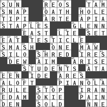 ACROSS 1. Player for Phoenix 4. Vintage cars 8. Scottish cap 11. Fastener 13. Pledge 14. Hollow 15. Native american tent (variation) 16. Johnson of "Laugh-In" 17. Capital of Western Samoa 18. Paper fasteners 21. American astronaut and politician John 22. Compass direction 23. Untruth 25. Put into a specified state 26. Erode 29. One of the two male reproductive glands 32. Box-office sellout 34. Single 35. Opening into something insatiable 38. Grain storage tower 39. Tear up 41. Angers 43. Morning condensation 44. Direct toward a target or goal 45. Originate 46. SAT takers 50. _ moment's notice (2 wds.) 51. Car or cant ending 54. Binary compound 55. Ancient Greek god of war 57. High up in or into the air 59. Player piano 63. General guideline 64. Discontinue 67. SW Asia republic 68. Dutch treat 69. Migrant worker of the '30s 70. Ache 71. Lair 72. Exchanged or delivered for money 73. Compass dir. DOWN 1. Fast planes 2. A single undivided whole 3. California wine valley 4. Cooks with dry heat, as in an oven 5. Ewer handle 6. Baseball player Mel 7. A female animal or person 8. Drinks excessively 9. Place in a line 10. Intended 12. Corncob 14. Actor Linden 19. Thin strip of wood or metal 20. Compass dir. 21. Set 23. Actor's bit 24. On the rocks 26. Curvy letter 27. Among 28. Falsehood 30. Singer Mel 31. Arab leader 33. Sty mamas 36. Roberta Peters solo 37. 270 degrees 39. Saudi Arabian king (1953-1964) 40. Flintstone garb 42. Ocean 45. Toward the sea 47. Teat (slang) 48. Slept 49. Three (prefix) 51. Having ears or earlike features 52. Evade 53. Pitcher Ryan 56. Sever or remove by pinching or nipping 58. Opposite of masc. 60. Northwest Algerian city 61. (Had) reclined 62. Singer Murray 64. Mayday 65. Ring climax 66. Lubricate