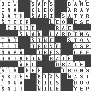ACROSS 1. Morning condensation 4. Plant excrements 8. Object of repulsion 12. _ tizzy (2 wds.) 13. Butter sub 14. Like ___ of sunshine 15. Pledge 17. Indian skirt 18. Man with strong sexual desires 19. Bull 21. Lion 23. Compass dir. 24. Bert's buddy 26. Actress Charlotte 28. Neighbor of Neb. 30. Preparing or cooking with lard 34. Make lace 37. Trig term 39. Portico 40. Biblical high priest 41. Collection of objects 43. Viper 44. California wine valley 46. Angers 47. Area sheltered from the wind 48. Popular '50s hangout 51. Assign a rank or rating to 54. Curve 55. A salt of uric acid 58. Title for a knight 61. To sift 63. Metal shackles 65. Atmospheres 67. Prejudice 71. Political cartoonist Thomas 72. Ancient Roman robe 73. Lubricates 74. Superhero pair 75. In a ____ (agitated or irritated) 76. Mediterranean tributary 77. Slangy assent DOWN 1. "Vaya con ____" 2. Maternal 3. Wetness 4. Mayday 5. Chicken ___ king 6. For each 7. Land 8. Sound made by sheep 9. Johnson of "Laugh-In" 10. Negative votes 11. Jane of fiction 16. Coop moms 18. Fly high 20. To free from 22. Epoch 25. Compass direction 27. Begley and Asner 29. Japanese brewing company 30. Prying instrument 31. Slanted text style (abbr.) 32. Sense of smell 33. Stare wonderingly 34. Look after 35. Having or resembling wings 36. Native american tent (variation) 38. And not 42. He sold his birthright 45. Actress Gardner 49. Blunders 50. Frozen water 52. Three (prefix) 53. Merit 56. Sycophant 57. Take place subsequently 58. Fast planes 59. Picture 60. Swiss mountan, "Queen of the Mountains" 62. Inky black, to poets 64. Cease 66. Ingest 68. One more than two 69. Everything 70. Compass dir.