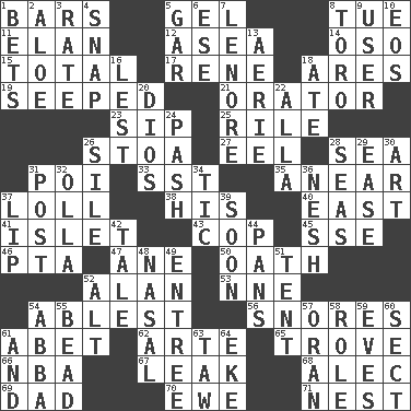 ACROSS 1. Oblong pieces of solid material 5. Set 8. Third day of the wk. 11. Style 12. Toward the sea 14. Bear (Spanish) 15. "_____ Recall" 17. French philosopher Descartes 18. Ancient Greek god of war 19. Oozed 21. Speaker 23. Small drink 25. Cause heat under the collar 26. Portico 27. Snakelike fish 28. Ocean 31. Luau course 33. Fast jet (abbr.) 35. Approach 37. Hang loosely or laxly 38. Part of HMS, perhaps 40. 90 degrees 41. Small island 43. Police officer (slang) 45. Compass dir. 46. Parent Teacher Association (abbr.) 47. A saturated hydrocarbon 50. Pledge 52. Actor Alda or Thicke 53. Compass dir. 54. Most capable 56. Sounds asleep 61. Collude with 62. Johnson of "Laugh-In" 65. Collection of objects 66. Basketball assoc. 67. Path through which fluid escapes 68. Actor Baldwin 69. Male parent 70. She-sheep 71. Egg locale DOWN 1. Stakes 2. _ vera 3. Pace 4. Fastener 5. Slender fish 6. Compass dir. 7. Poe poem 8. "Corrida" creature 9. One who uses or employs something 10. Greek goddess of the dawn 13. Nest on high 16. For fear that 18. Had dinner 20. "Vaya con ____" 22. Silent film actress Nazimova 24. Romantic infatuation 26. Drop; flow; fall 28. Oceans 29. Comfort 30. Nonscientific branch of learning 31. Mail 32. Spanish pot 34. Nervous spasm 36. Tender 37. Mouth edge 39. Within a short period 42. Lie 44. Baking dishes 48. Relating to the nose 49. Main course 51. Portable shelter 52. The first octave above the treble staff 54. Swedish rock group 55. Necklace unit 57. NW Algerian seaport 58. Hero or heavy, e.g. 59. Nights before holidays 60. Religious group 61. Also 63. The 23rd letter of the Hebrew alphabet 64. Supplement with great effort