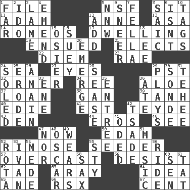 ACROSS 1. Do some clerical work 5. Science/research agcy. 8. Be seated 11. First man 12. Queen of England 1702-14 13. White ___ sheet 14. Lover boys 17. Home 19. Took place subsequently 21. Opts 22. South Vietnam president (1954) 23. Actress Charlotte 24. Ocean 27. Sight organs 29. Pacific Standard Time (abbr.) 32. Channel Islands abalone 34. To separate or throw off 36. _ vera 37. Grant temporary use of 38. Separate the seeds from cotton 39. Hyperbolic tangent 40. Singer Brickell 41. Eastern Standard Time (abbr.) 42. Miss Universe 1986, Barbara Palacios _ 43. Lair 44. Greek god of love 46. Observe 47. Immediately 50. Dutch treat 52. Full of chinks, cracks, or crevices 55. Sowing specialist 57. Cloudy 59. Stop 62. Bit 63. Like ___ of sunshine 64. It may be bright or harebrained 65. One (Scot) 66. Acura sports coupe 67. Penny DOWN 1. At a great distance 2. Wedding promise 3. Unable to walk 4. Make improvements or corrections to 5. Compass dir. 6. Scornful expression 7. Chap (slang) 8. Ketch in the Levant 9. Is not 10. Labels 12. Say or write further 15. Flexible twig of a willow tree 16. Chop _ 18. Area sheltered from the wind 20. Develop 24. Having a sole or soles 25. Eat (away) 26. At full speed 28. Gospel singer Marvin 29. Romps 30. Something which is sent 31. Giggle 33. Compass dir. 35. Main course 36. Had dinner 42. Sadhe (variant) 45. Wrote a lyric poem 47. Not either 48. Motion picture award 49. Puts on (as clothing) 51. Of or pertaining to a meson 52. Roll call or roster of names 53. "Terrible" tsar 54. Ancient Persian 55. Filthy place 56. Travel on or in a vehicle 58. Saxophone 60. Elected rep. 61. Make lace