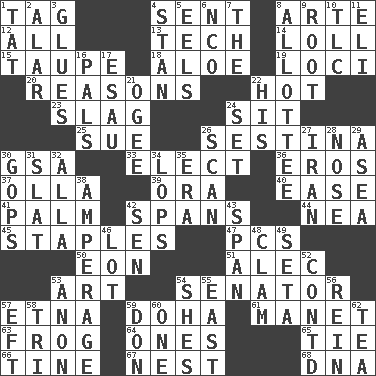 ACROSS 1. Label 4. Posted 8. Johnson of "Laugh-In" 12. 100% 13. Technology 14. Hang loosely or laxly 15. Grayish beige 18. Medicinal plant 19. Locales 20. Thinks logically 22. Being at a high temperature 23. Volcanic refuse 24. Be seated 25. Take to court 26. French poetic form 30. Girls' org. (abbr.) 33. Opt 36. Greek god of love 37. Rounded earthenware pot or jar 39. Mouth or opening 40. Comfort 41. Inside of hand 42. Connects, as a bridge 44. Teachers' org. 45. Paper fasteners 47. Personal Computers (abbr.) 50. A really long time 51. Actor Baldwin 53. Tate display 54. Elected representative 57. Inactive volcano in Sicily 59. Capital of the state of Qatar 61. French painter Edouard 63. Tree-dwelling hopper 64. Washington bills 65. Make a knot 66. Prong on a fork 67. A home for chicks 68. Heredity factor (abbr.) DOWN 1. Make lace 2. Having or resembling wings 3. Adhesives 4. Comedian Laurel of Laurel & Hardy 5. Snakelike fish 6. Non-commissioned officer (abbr.) 7. Definite Article 8. One to whom something is allotted 9. Carrot, for example 10. Affectionate concern, for short 11. Connecticut Ivy Leaguer 16. Friends 17. He sold his birthright 21. Double curve, resembling the letter S 22. Part of HMS, perhaps 24. Put into a specified state 26. Glance over 27. SW Asia republic 28. Characteristic smell of wine 29. Toward the sea 30. Republicans 31. Narrow board 32. Silent film actress Nazimova 34. Chops off 35. Period 38. Electrical Measurement 42. Elected rep. 43. Connect, as a bridge 46. Car dealer's back yard 48. Dollar (slang) 49. Bristle 52. Continued (abbr.) 53. At once, immediately (arch.) 54. "______ My Girl" (Turtles hit) 55. 90 degrees 56. It's straight from the horse's mouth 57. Lizard (obsolete) 58. Three (prefix) 59. Spanish title 60. Single 62. Afternoon social gathering