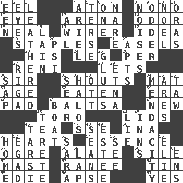 ACROSS 1. Snakelike fish 4. Tiny particle 8. Words to Nanette 12. First lady 13. Sports stadium 14. Scent 15. Be tempered by heat 17. One who wires 18. The content of cognition 19. Paper fasteners 21. Artist's stands 23. Part of HMS, perhaps 24. Part of a journey 26. For each 27. Painter Guido (1575-1642) 28. Allows 30. Title for a knight 31. Yells 34. Floor covering 37. Grow older 38. Eroded 39. Epoch 40. Groovy apt. 41. Greek mezzo-soprano Agnes 42. ___ Haven, CT 43. "Corrida" creature 44. Flaplike coverings 46. Afternoon social gathering 47. Compass dir. 50. _ tizzy (2 wds.) 51. Centers of feelings and intuitions 54. Substance 57. Legendary monster 58. Having winglike extensions 60. Drop; flow; fall 62. Vertical spar for supporting sails 63. Indian princess (variant) 64. Shallow baking pan 65. Singer Brickell 66. Domed church section 67. Consenting reply DOWN 1. Car or cant ending 2. Nights before holidays 3. Resembling or made to resemble leather 4. Satellite of Uranus 5. Laconic 6. Single 7. Female horse 8. Annoying sounds 9. More peculiar 10. Christmas carol 11. Mouths or openings 13. Leather borer 16. (Had) reclined 20. 23rd letter of the Greek alphabet 22. Tenement units (abbr.) 25. Cements 27. Port city in Latvia 29. Inactive volcano in Sicily 30. Plant excrement 31. Wither 32. Radiant circles of light 33. Baseball player Mel 34. Ananias' fault 35. Ancient Greek god of war 36. The 23rd letter of the Hebrew alphabet 41. Water vessel 43. Cylindrical with tapered ends 44. Whopper 45. Taverns 46. Tarsus (plural) 48. Actors Connery and Penn 49. First name in cosmetics 51. Dwelling 52. Mild oath 53. "Two Mules for Sister ____" 55. Perceive with the eye 56. Writer Wiesel 59. Pet locale 61. Followers of ems