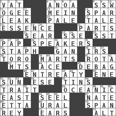 ACROSS 1. Large container 4. Small Philippine buffalo 8. Compass dir. 11. Double curve, resembling the letter S 13. Chow _ 14. Coast Guard woman 15. Path through which fluid escapes 16. Diluted with white 17. Lie 18. Substance 21. Pieces 22. Dry up 23. Compass dir. 25. Fast jet (abbr.) 26. Infant food 29. Orators 32. Staphylococcus 34. Separate the seeds from cotton 35. Big collection agency 38. "Corrida" creature 39. Shops 41. Roll call or roster of names 43. Mountains (abbr.) 44. Adept person 45. Debunk (Brit. slang) 46. Plea 50. Compass dir. 51. Player for Phoenix 54. Compass dir. 55. Airtight sealed metal containers 57. Distinguishing feature 59. Pertaining to the sea 63. Compass direction 64. Stitch closed the eyes of (a falcon) 67. Nathan's nickname 68. Singer James 69. Mountain range 70. Connect, as a bridge 71. Marina Del _, California 72. Hearing organs 73. The first octave above the treble staff DOWN 1. Short-tailed, large-bodied rat 2. Ripens 3. Afternoon social gatherings 4. Electrical Unit 5. Teachers' org. 6. Petroleum 7. A saturated hydrocarbon 8. Practice fights 9. Table seasonings 10. Obtain by seizing forcibly or violently 12. Makes supply last 14. R.R. building 19. Tender 20. Head covering 21. For each 23. Three-handed card game 24. Elected reps. 26. Pacific Standard Time (abbr.) 27. Smallest unit of an element 28. Piece 30. Match 31. Male parent of an animal 33. Introduce or present, as a question 36. Loose flowing garment 37. Comedian Laurel of Laurel & Hardy 39. Floor protectors 40. Measure of real estate 42. Ripen 45. Unit of force 47. Fish or hair follower 48. Ringlike coral islands and reefs 49. Nervous spasm 51. Guide 52. A salt of uric acid 53. Thoroughly unpleasant 56. Without 58. Call ___ day 60. California wine valley 61. Slanted text style (abbr.) 62. Penny 64. Institute legal proceedings 65. Epoch 66. Ewer handle