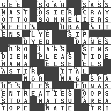 ACROSS 1. Unit of force equal to gravity 4. Fly high 8. Backtalk 12. Political cartoonist Thomas 14. Flexible twig of a willow tree 16. Supercomputer manufacturer 17. "Beetle Bailey" pooch 18. Wine waiters 20. Confronts 22. Chief or king in Benin or Nigeria 23. Be seated 24. Followers of ems 25. Potassium hydroxide 28. Small drink 30. Colored 31. Natives or inhabitants of Denmark 35. Sis' sibling 37. Fails to keep up a pace 40. Elected reps. 41. South Vietnam president (1954) 42. Entreaties 44. Event that recurs at intervals 45. Grandmother 46. Otherwise 47. Raised railways 48. Being in motion 50. Slanted text style (abbr.) 52. Not either 54. Tired old horse 55. Health resort 58. Part of HMS, perhaps 61. French article 63. Ferber et al. 65. Pleas 70. I made a mistake 71. Portico 72. Taiwanese island in East China Sea 73. Length times width 74. Drink excessively 75. Nathan's nickname 76. Three (prefix) DOWN 1. Dwarf 2. Eroded 3. _____ Park, CO 4. Distress signal 5. Bear (Spanish) 6. Direct toward a target or goal 7. San ____ (Riviera town) 8. _-fi 9. Ancient Greek god of war 10. Indian skirt 11. System (abbr.) 13. Small child 15. Confederate soldiers (slang) 19. Put down 21. Stealthy 26. Sharp bark 27. Peak District village in England 29. Soft color 30. Realm 32. Famous astronaut Armstrong 33. Extremities 34. Compass dir. 35. Prejudice 36. Monthly bill 38. Set 39. Indian antelope 41. Heredity factor (abbr.) 43. Stalk of a moss capsule 49. Hero or heavy, e.g. 51. Grow older 53. 480, 500 or 516 sheets of paper 55. Derisive sound 56. Some stationery 57. Slender Brazilian palm 58. Behest 59. To the inside or interior of 60. Obstruct or block passage 62. Comedian Laurel of Laurel & Hardy 64. ___ good deed 66. Actress Charlotte 67. Call ___ day 68. Eastern Standard Time (abbr.) 69. Take to court