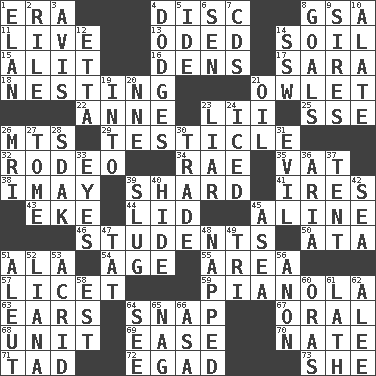ACROSS 1. Period 4. Compact _ 8. Girls' org. (abbr.) 11. Moving, as bait 13. Wrote a lyric poem 14. Land 15. Came down and settled, as after flight 16. Lairs 17. "Two Mules for Sister ____" 18. Snuggling 21. A small or young owl 22. Singer Murray 23. Cards in a Roman deck? 25. Compass dir. 26. Mountains (abbr.) 29. A testis 32. Cowboy competition 34. Actress Charlotte 35. Large container 38. "If ____ say so..." 39. Broken piece 41. Angers 43. Make supply last 44. Hat (slang) 45. Place in a line 46. SAT takers 50. _ moment's notice (2 wds.) 51. Chicken ___ king 54. Ripen 55. Length times width 57. It is permitted: Lat. 59. Player piano 63. Hearing organs 64. Fastener 67. Of the mouth 68. A single undivided whole 69. Comfort 70. Nathan's nickname 71. Small boy 72. Mild oath 73. A female animal or person DOWN 1. Flair 2. Cause heat under the collar 3. Deliberation 4. Evades 5. Binary compound 6. Elected rep. 7. Music discs 8. Scores awarded for successful feats 9. Titles for men of rank and authority 10. Having winglike extensions 12. Singer James 14. Compass dir. 19. To the inside or interior of 20. Compass dir. 21. Petroleum 23. One who doesn't tell the truth 24. On the rocks 26. Medical imaging device (abbr.) 27. Heavy book 28. Neighbor of Neb. 30. Buy and sell 31. Tending to cause great harm 33. Sight organs 36. Roberta Peters solo 37. Portable shelter 39. A hard, heavy blow 40. Flintstone garb 42. Ocean 45. At sea 47. Make lace 48. Slept 49. Three (prefix) 51. Eskimo relative 52. Climbing, woody, usually tropical vines 53. Bitter 56. At once, immediately (arch.) 58. Eastern Standard Time (abbr.) 60. Mouths or openings 61. Thin strip of wood or metal 62. Toward shelter 64. Perceive with the eye 65. Tired old horse 66. White ___ sheet