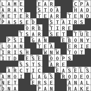 ACROSS 1. Unable to walk 5. Ewer handle 8. Tax preparer (abbr.) 11. Like ___ of sunshine 12. Portico 14. Possessed 15. Distance measurement 17. Pull into pieces 18. Look after 19. Went by 21. Flight of steps 23. Globe 25. Hoop that covers a wheel 26. Russian ruler of old 27. Put into a specified state 28. Third day of the wk. 31. Air pressure measure (abbr.) 33. Separate the seeds from cotton 35. Dark wood 37. Grant temporary use of 38. Afternoon social gathering 40. One of the Great Lakes 41. From or relating to Ireland 43. Compass dir. 45. Small child 46. It would 47. Compass dir. 50. I made a mistake 52. Fast planes 53. "We ___ not amused" (Victoria) 54. Northern region 56. Artist's stands 61. Mine, in Marseilles 62. Falls behind 65. Cowboy competition 66. Remaining after all deductions 67. Celtic language 68. Of or related to the anus 69. Heredity factor (abbr.) 70. Baking dish 71. Libertine DOWN 1. Desk light 2. Type of rug 3. Floor coverings 4. Sight organs 5. Eastern Standard Time (abbr.) 6. Had dinner 7. Cooks with dry heat, as in an oven 8. "Mermaids" star 9. Zero-star reviews 10. Find the sum of 13. Nick name for Arthur 16. Vintage cars 18. Neckwear 20. To draw with force 22. Johnson of "Laugh-In" 24. Naughty child 26. Canisters 28. "Corrida" creature 29. A single undivided whole 30. Sight organ 31. Sweet dark-red dessert wine 32. Expressed in words 34. ___ Haven, CT 36. Antes 37. Cards in a Roman deck? 39. Small Philippine buffalo 42. Behest 44. Had on 48. Vertical member of a panel or frame 49. Fortification 51. Lightbulb-shaped fruit 52. _-fi 54. So be it 55. Round or rotation of duties 57. Fly high 58. Pulitzer Prize-winning author Ferber 59. Path through which fluid escapes 60. Flatfish 61. Added to 63. Girls' org. (abbr.) 64. Elected rep.