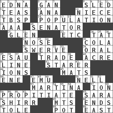 ACROSS 1. Pulitzer Prize-winning author Ferber 5. Separate the seeds from cotton 8. Downhill vehicle 12. Beverages made from leaves 13. Santa ___, CA 14. Sibling's daughter 15. Cook's measure (abbr.) 16. Census information 19. American Automobile Association (abbr.) 20. Elected representative 21. Small, secluded valley 23. And so on (abbr.) 24. Make lace 27. Olfactory organ 30. Root beer relative 31. Turn aside suddenly 34. Relating to the mouth 35. Son of Isaac 38. Swap 40. Measure of real estate 41. Actor's bit 42. A viewer who gazes fixedly 44. Charged particles 45. Floor coverings 46. Compass dir. 47. Australian flightless bird 50. 1994 drama film starring Jodie Foster 53. Chrissie's court nemesis 57. Electrically charged atom 59. Conciliate 63. "Two Mules for Sister ____" 64. Bake eggs in their shells 65. Mountains (abbr.) 66. Extremities 67. Lacquered or enameled metalware 68. Cooking vessel 69. Compass direction DOWN 1. Singer James 2. Debunk (Brit. slang) 3. Relating to the nose 4. Cleo's killer 5. Stare wonderingly 6. Soon (poet.) 7. California wine valley 8. Be seated 9. Flowery wreath 10. Environmental prefix 11. Lair 14. Drug cop 17. Shoshoni 18. Car dealer's back yard 20. Frozen precipitation 22. Takes place subsequently 24. Torque (variant) 25. Having or resembling wings 26. Falsehood 28. Put into a specified state 29. Blunders 30. Rough 32. Large container 33. Dutch treat 35. Writer Wiesel 36. The Jewish people; Israel 37. Queen of England 1702-14 39. Epoch 43. Inactive volcano in Sicily 47. Arab leader 48. Floor protector 49. RI univ. 51. Climbing, woody, usually tropical vines 52. Titled peers of a realm 54. Pack (down) 55. "Tell ____ the Marines!" 56. Egg locale 58. Political cartoonist Thomas 59. Pacific Standard Time (abbr.) 60. 17th letter of the Greek alphabet 61. Lubricate 62. Before (prefix) 63. Perceive with the eye