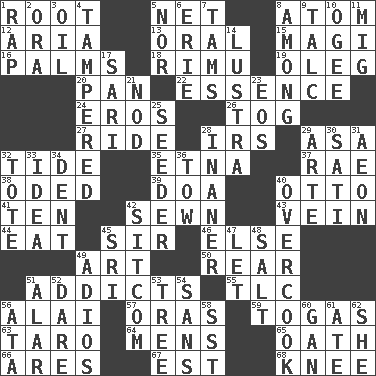 ACROSS 1. Carrot, for example 5. Remaining after all deductions 8. Smallest unit of an element 12. Operatic vocal solo 13. Taken by mouth 15. Wise men 16. Insides of hands 18. Tall New Zealand timber tree 19. Cassini of fashion 20. Baking dish 22. Center 24. Greek god of love 26. Coat; cloak 27. Travel on an animal 28. Big collection agency 29. White ___ sheet 32. Periodic rise and fall of the sea level 35. Inactive volcano in Sicily 37. Actress Charlotte 38. Wrote a lyric poem 39. ___ good deed 40. Von Bismarck 41. "___ Little Indians" 42. Stitched 43. Distinctive style or manner 44. Ingest 45. Title for a knight 46. Otherwise 49. Tate display 50. Located in or toward the back 51. Inveterate users 55. Affectionate concern, for short 56. Jai ____ 57. Mouths or openings 59. Ancient Roman robes 63. Edible starchy tuberous root 64. Not women's 65. Pledge 66. Ancient Greek god of war 67. Eastern Standard Time (abbr.) 68. Leg joint DOWN 1. Reproach for some lapse or misdeed 2. Mouth or opening 3. Lubricate 4. ________ with (broke a safety seal) 5. And not 6. One of the Great Lakes 7. Scottish caps 8. Amid 9. Baby powder 10. Double curve, resembling the letter S 11. Russian fighter aircraft 14. A period of five years 17. Indian skirt 21. Lower and raise head in agreement 23. Greek goddess of the dawn 25. Sowing specialist 28. More lacking in sense or substance 29. Johnson of "Laugh-In" 30. Suttee (variant) 31. Period of immesurable duration 32. Carry 33. The content of cognition 34. Gouge 36. Pull behind 40. Burn the roast 42. "Cheers" or "Ellen" 45. _ Lanka 47. Allow 48. Table seasoning 49. Goodbye (Sp.) 51. Having or resembling wings 52. Have the gumption 53. Relationship diagram 54. Without 56. "One Day ___ Time" 58. Fast jet (abbr.) 60. Separate the seeds from cotton 61. Had dinner 62. A female animal or person
