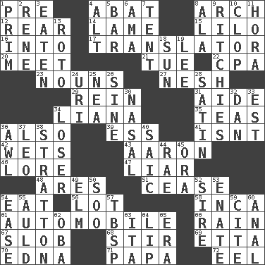ACROSS 1. Before (prefix) 4. Blind as ____ 8. Bowlike part 12. Tail end 14. Unable to walk 15. _ and Stitch 16. To the inside or interior of 17. Interpreter 20. Rendezvous 21. Third day of the wk. 22. Numbers guy (abbr.) 23. Parts of speech 27. Delicate 29. It's straight from the horse's mouth 31. Helper 34. Climbing, woody, usually tropical vines 35. Beverages made from leaves 36. In addition 39. Double-curved letter 41. Is not 42. Soaks 43. Composer Copland 46. Old wives' tales, e.g. 47. One who doesn't tell the truth 48. Ancient Greek god of war 51. Stop 54. Consume 56. Car dealer's back yard 58. South American Indian 61. Form of transportation 66. Water falling in drops from the sky 67. Messy guy 68. Agitate 69. Singer James 70. Pulitzer Prize-winning author Ferber 71. Dad 72. Snakelike fish DOWN 1. Demure 2. French philosopher Descartes 3. Ingested 4. Keyboard modifier key 5. Long, evenly shaped piece 6. Nanny (var.) 7. Portable shelter 8. Wing 9. Actors Guy, Robert Welles, and Clint 10. Hoof sound 11. Israeli folk dance 13. Printing process, for short 18. Player for Phoenix 19. Area sheltered from the wind 24. RI univ. 25. Teachers' org. 26. Trig term 28. Smooth fabric 30. Relating to the nose 32. One of the 12 tribes of Israel 33. Eastern Standard Time (abbr.) 34. Failure 36. Leather borer 37. Lion 38. Ski resort town in Vermont 40. Ketch in the Levant 44. Actress Charlotte 45. Mouth or opening 49. Shade tree 50. "Barney Miller" actor Jack 52. Male parent of an animal 53. Related on the mother's side 54. Comfort 55. Old (Scot.) 57. Cook's measure (abbr.) 59. Quote 60. Of or related to the anus 62. Chief or king in Benin or Nigeria 63. Call ___ day 64. Mouth edge 65. Period