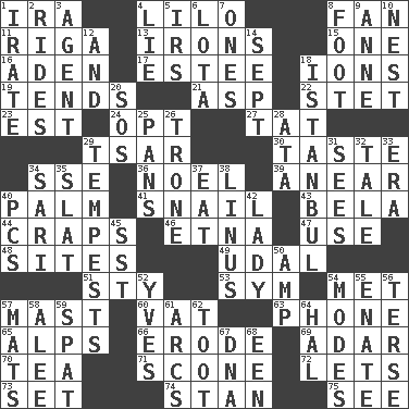 ACROSS 1. Retirement account (abbr.) 4. _ and Stitch 8. Air blower 11. Port city in Latvia 13. Metal shackles 15. Single 16. Arabian gulf 17. First name in cosmetics 18. Charged atoms 19. Watches over 21. Viper 22. Proofreading order 23. Eastern Standard Time (abbr.) 24. Elect 27. Make lace 29. Russian ruler of old 30. Clothes sense 34. Compass dir. 36. Christmas carol 39. Approach 40. Inside of hand 41. Slow-paced one 43. Actor Lugosi 44. Dice game 46. Inactive volcano in Sicily 47. Purpose 48. Locates 49. Freehold land 51. Filthy place 53. Symbol (abbr.) 54. Was introduced to 57. Vertical spar for supporting sails 60. Large container 63. Give a jingle 65. High mountains 66. Eat (away) 69. The sixth month of the Jewish calendar 70. Beverage made from leaves 71. Biscuitlike quick bread 72. Allows 73. Arrange properly for use 74. Comedian Laurel of Laurel & Hardy 75. Observe DOWN 1. Feeling or showing extreme anger 2. Amusement-park features 3. Representative 4. Untruth 5. Big collection agency 6. Globular water bottle used in Asia 7. Washington bills 8. Pick up the tab 9. Queen of England 1702-14 10. Egg locale 12. Plus 14. Back-to-school mo. 18. Byzantium, centuries later 20. Distress signal 25. Zero-star reviews 26. Marketplace scale 28. _ moment's notice (2 wds.) 29. Storms 31. Observes 32. Story 33. Period 34. Indian skirt 35. Narrow board 37. Erode 38. "_ and Lucy" (Charlie Brown theme song) 40. Personal Computers (abbr.) 42. Kenny Rogers chart-topper in '80 45. Fast jet (abbr.) 50. Electrical Unit 52. Jacques Cousteau's middle name 54. Methods 55. Related on the mother's side 56. Laconic 57. Floor coverings 58. Toward shelter 59. Petty quarrel 61. Arches 62. A blast of a horn 64. Actor Linden 67. Heredity factor (abbr.) 68. Car or cant ending