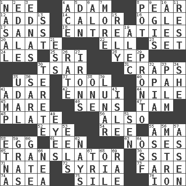 ACROSS 1. Born 4. First of billions? 8. Lightbulb-shaped fruit 12. Does sums 14. Bodily heat indicating an inflammation 16. Stare 17. Without 18. Pleas 20. Having winglike extensions 22. Pipe bend 23. Arrange properly for use 24. French article 25. _ Lanka 28. Slangy assent 30. Russian ruler of old 31. Dice game 35. Purpose 37. Utensil 40. Brightly colored fish 41. The sixth month of the Jewish calendar 42. World-weariness 44. The longest river in the world 45. Female horse 46. Elected reps. 47. Scottish cap 48. Food holder 50. In addition 52. Sight organ 54. To sift 55. Wet nurse (var.) 58. Ovum 61. Car or cant ending 63. Olfactory organs 65. Interpreter 70. Fast planes 71. Nathan's nickname 72. Damascus' land 73. Conductor's collection 74. Toward the sea 75. Filth; sediment 76. Electrically charged atom DOWN 1. Relating to the nose 2. Peak District village in England 3. Ferber et al. 4. Adept person 5. Daniel's nick name 6. Keyboard modifier key 7. Greater amount 8. Cooking vessel 9. Armor plate that protects the chest 10. Toward shelter 11. Relief 13. Fast jet (abbr.) 15. Trust 19. Actor Baldwin 21. Double-curved letter 26. Pace 27. Removes the wrinkles 29. Right away 30. Cylindrical with tapered ends 32. Capital of Western Samoa 33. Inside of hand 34. A female animal or person 35. Hereditary estate 36. "Two Mules for Sister ____" 38. Single 39. Type of eclipse 41. Electrical Unit 43. Small island 49. Snake ____ (dice throw) 51. Elected rep. 53. Snakelike fish 55. Slender Brazilian palm 56. Paris' subway 57. NE Netherlands city 58. Inactive volcano in Sicily 59. Pate de foie ____ 60. Yard entry 62. Negative votes 64. Order of Saint Francis (abbr.) 66. Teachers' org. 67. Three (prefix) 68. Lubricate 69. Actress Charlotte