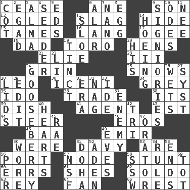 ACROSS 1. Desist 6. A saturated hydrocarbon 9. Boy, to dad 12. Stared 13. Volcanic refuse 14. Flintstone garb 15. Domesticates 16. Austrian-born American filmmaker Fritz 17. Double curve, resembling the letter S 18. Male parent 19. "Corrida" creature 20. Coop moms 21. Writer Wiesel 23. One more than two 24. Amused look 25. Frozen precipitation (plural) 28. Lion 30. Ancient Celtic tribe of eastern Britain 34. Jennifer or Joel 35. Wedding promise 36. Exchange 38. ___ a Wonderful Life 39. Food container 41. Representative 43. Eastern Standard Time (abbr.) 44. Bull 46. Greek god of love 48. Sound made by sheep 49. Arab leader 50. We are 51. _ Jones' Locker 53. "We ___ not amused" (Victoria) 56. Sweet dark-red dessert wine 57. Thickened enlargement 58. Check the growth or development of 60. Blunders 61. "______ My Girl" (Turtles hit) 62. Twentieth part of a lira 63. Marina Del _, California 64. Avid follower 65. Take or capture by force DOWN 1. Small bed 2. Mild oath 3. _ mater 4. Sowing specialist 5. Begley and Asner 6. Having or resembling wings 7. Billionth: prefix 8. Oval reproductive body of a fowl 9. Seigniories (variant) 10. Lyric poems 11. Born 13. A type of plum 14. Weeding 19. Tinged 20. Part of HMS, perhaps 22. Cards in a Roman deck? 24. Sour, prickly fruit 26. Soaks 27. System (abbr.) 28. Flaplike coverings 29. Prepare for publication 31. Epoch 32. Tired old horse 33. Binary compound 37. Foe 40. Centers 42. Three (prefix) 45. Actress Charlotte 47. Speaker 49. Nights before holidays 50. Had on 51. Capital of the state of Qatar 52. Arabian gulf 54. Court order 55. Conclusions 56. For each 57. Overdraft (abbr.) 58. Compass dir. 59. Small child