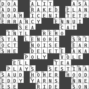 ACROSS 1. ___ good deed 4. Set down 8. White ___ sheet 11. Increase 12. Moved through 14. Style 15. Wander 17. Ancient Celtic tribe of eastern Britain 18. False hair 19. The state or an instance of erring 21. World-weariness 23. Ocean 24. Feline 25. International (abbr.) 27. San ____ (Riviera town) 30. R.R. building 31. Poe poem 34. _ Lanka 37. Sep. follower 38. Annoying sound 39. Hearing organ 40. A female animal or person 41. Keyboard key 43. Alias (abbr.) 44. Much (prefix) 45. Grand slam 47. Pipe bend 49. Afternoon social gathering 50. Romps 52. French poetic form 56. Saudi Arabian king (1953-1964) 57. Home run 60. Parka part 61. Whirlpool 62. Entertaining tales 63. Compass dir. 64. Compass dir. 65. Travel on or in a vehicle 66. Boy, to dad DOWN 1. Have the gumption 2. Aroma 3. The sixth month of the Jewish calendar 4. N. Chile seaport 5. Made of lace 6. Mamie's husband 7. "___ Little Indians" 8. Eskimo relative 9. Suttee (variant) 10. A saturated hydrocarbon 13. Pass on 14. Inactive volcano in Sicily 16. Vertical spar for supporting sails 20. 1994 drama film starring Jodie Foster 22. Non-commissioned officer (abbr.) 25. Hankering 26. Nathan's nickname 27. Turbulent 28. Celtic language 29. Confront 30. Mayday 32. Inside; within (prefix) 33. Christmas carol 34. Lick closed 35. Immoral or dissolute person 36. Retirement account (abbr.) 42. Nights before holidays 44. Strand of rope, yarn or thread 46. Pledge 47. Dodge 48. Kenny Rogers chart-topper in '80 49. Laconic 50. Writing tablets 51. Like a shrinking violet 52. Post 53. Charged particles 54. Words to Nanette 55. An important port of Yemen 56. Observe 58. Rowing implement 59. Medical imaging device (abbr.)