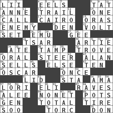 ACROSS 1. Cards in a Roman deck? 4. Snakelike fish 8. Make lace 11. Queen of England 1702-14 13. Drop behind 15. Single 16. Give a ring to 17. Capital of Egypt 18. Mouths or openings 19. Foe 21. Lair 22. Electrical Unit 23. Put into a specified state 24. Australian flightless bird 27. Unit of force equal to gravity 29. Russian ruler of old 30. Nick name for Arthur 34. Had dinner 36. Pack (down) 39. Collection of objects 40. Relating to the mouth 41. Bull 43. Actor Alda or Thicke 44. Exchanges for money 46. Otherwise 47. Nine, plus one 48. Witty Wilde 49. At one time in the past 51. Hat (slang) 53. R.R. building 54. Nursemaid (var.) 57. Australian parrot (variant) 60. Connecticut Ivy Leaguer 63. All-night dance parties 65. Toward shelter 66. Music written for nine 69. Plant holders 70. Commissioned military rank (abbr.) 71. Add up to 72. Hoop that covers a wheel 73. "Barney Miller" actor Jack 74. Torque (variant) 75. Spanish title DOWN 1. Shoestrings 2. Empty; void 3. An arm off of a larger body of water 4. And so on (abbr.) 5. Epoch 6. Put down 7. The founder of a family 8. "Corrida" creature 9. Of or related to the anus 10. Trial 12. Shade tree 14. Yearn 18. Make much ado about nothing 20. Consenting reply 25. Floor coverings 26. A salt of uric acid 28. Consume 29. Copy Pinocchio 31. Lacquered or enameled metalware 32. "Terrible" tsar 33. Car or cant ending 34. Ancient Greek god of war 35. Baby powder 37. Cartoonist voice _ Blanc 38. Mexican monetary units 40. Bear (Spanish) 42. Monthly bill 45. _ Lanka 50. 4-wheeled motor vehicle 52. Undesirable depression on a surface 54. Keep away from 55. Paris' subway 56. NE Netherlands city 57. Fails to keep up a pace 58. Margarine 59. Western Nevada city 61. Spoils 62. To the inside or interior of 64. Fitting 67. Hearing organ 68. Affectionate concern, for short