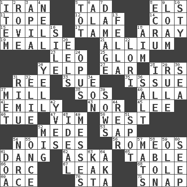 ACROSS 1. SW Asia republic 5. Small boy 8. Raised railways 11. Drink excessively 12. Norwegian king 14. Small bed 15. Vices 17. Docile 18. Like ___ of sunshine 19. Ear of corn 21. Plant genus of onion and garlic 23. Lion 25. Take by theft 26. Sharp bark 27. Ewer handle 28. Big collection agency 31. To riddle 33. Institute legal proceedings 35. Come out of 37. Place where flour is made 38. Distress signal 40. Silent film actress Nazimova 41. Poet Dickinson 43. And not 45. Area sheltered from the wind 46. Third day of the wk. 47. Zeal 50. Compass direction 52. Ancient Persian 53. Plant excrement 54. Annoying sounds 56. Lover boys 61. Mild oath, euphamism for damn 62. "____ silly question..." 65. Eating place 66. The grampus (Milton) 67. Path through which fluid escapes 68. Lacquered or enameled metalware 69. Adept person 70. R.R. building 71. Fastener DOWN 1. A distinct part 2. Be footloose 3. Capital of Western Samoa 4. 1994 drama film starring Jodie Foster 5. Small child 6. Insect wing 7. Break 8. Shade of tan 9. Rich soil 10. Filthy place 13. Chap (slang) 16. Filth; sediment 18. Direct toward a target or goal 20. Snakelike fish 22. Australian parrot (variant) 24. Musical composition 26. Shout 28. Small island 29. Governing power 30. Ocean 31. Tall New Zealand timber tree 32. Writer Wiesel 34. A really long time 36. Table seasoning 37. Was introduced to 39. Sty mamas 42. Jacques Cousteau's middle name 44. Posterior 48. Standard of perfection 49. Makes clutter 51. Specific locale 52. Russian fighter aircraft 54. Drug cop 55. At one time in the past 57. Floor protectors 58. Inky black, to poets 59. Water jar 60. Ooze 61. ___ good deed 63. Krazy ___ of comics 64. Alias (abbr.)