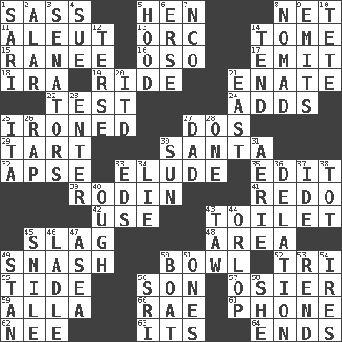 ACROSS 1. Backtalk 5. Layer 8. Fish or hair follower 11. Eskimo relative 13. The grampus (Milton) 14. Heavy book 15. The wife of a rajah (variant) 16. Bear (Spanish) 17. Send forth 18. Retirement account (abbr.) 19. Travel on or in a vehicle 21. Related on the mother's side 22. Trial 24. Does sums 25. Pressed 27. Two (Sp.) 29. Small pie 30. Before Barbara or Clara 32. Domed church section 33. Evade 35. Prepare for publication 39. "The Thinker" sculptor 41. Do over again 42. Purpose 43. Rest room 45. Volcanic refuse 48. Type of rug 49. Box-office sellout 50. Soup holder 52. Three (prefix) 55. Periodic rise and fall of the sea level 56. Boy, to dad 57. Flexible twig of a willow tree 59. Silent film actress Nazimova 60. Actress Charlotte 61. Give a jingle 62. Born 63. ___ a Wonderful Life 64. Extremities DOWN 1. Indian skirt 2. Having or resembling wings 3. Elected representatives 4. Institute legal proceedings 5. Parka part 6. Celtic language 7. Non-commissioned officer (abbr.) 8. Roamer 9. Sends forth 10. Wig 12. Laconic 14. Watch over 20. It would 21. Compass direction 23. Keyboard key 25. Call ___ day 26. Strike 27. Male parent 28. Single 30. Player for Phoenix 31. Nest on high 33. Begley and Asner 34. Falsehood 36. Conveyance 37. Binary compound 38. Small child 40. Ending for "Through" and "Enough" 43. The 23rd letter of the Hebrew alphabet 44. Lowest deck of a ship 45. Grin 46. Dipping utensil 47. Toward the sea 49. Comedian Laurel of Laurel & Hardy 50. Water vessel 51. Singles 53. Tear apart 54. Angers 56. _ Lanka 58. A female animal or person