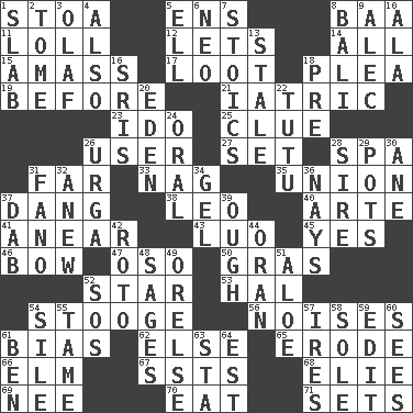 ACROSS 1. Portico 5. Followers of ems 8. Sound made by sheep 11. Hang loosely or laxly 12. Allows 14. 100% 15. Collect or gather 17. Plunder 18. Entreaty 19. Prior to 21. Of or pertaining to medicine 23. Wedding promise 25. A slight indication 26. One who makes use of a thing 27. Put into a specified state 28. Health resort 31. Distant 33. Tired old horse 35. The state of being joined or united 37. Mild oath, euphamism for damn 38. Lion 40. Johnson of "Laugh-In" 41. Approach 43. Nilotic language 45. Consenting reply 46. Ribbon knot 47. Bear (Spanish) 50. Pate de foie ____ 52. Play the lead 53. Actor Linden 54. Moe Howard, for one 56. Annoying sounds 61. Prejudice 62. Otherwise 65. Wear away 66. Shade tree 67. Fast planes 68. Writer Wiesel 69. Born 70. Ingest 71. Puts into a specified state DOWN 1. Thick slice 2. Heavy book 3. Norwegian king 4. In addition 5. Pipe bend 6. Modern: prefix 7. Unemotional ones 8. Indonesian resort city 9. Actor Baldwin 10. In the manner of 13. Showing deterioration from age 16. Indian titles of respect 18. Before (prefix) 20. Genesis locale 22. Ballerina skirt 24. Relating to the mouth 26. Capital and largest city of Mongolia 28. Title for a man of rank and authority 29. Plant holders 30. A saturated hydrocarbon 31. Papal veil 32. Afresh 34. Set 36. Negative votes 37. Small moist lump or mass 39. Ending for "Through" and "Enough" 42. Printing process, for short 44. NW Algerian seaport 48. Gurus 49. Threatening words 51. _ vera 52. Distress signal 54. Filth; sediment 55. Not wild 57. Angers 58. Flatfish 59. Prepare for publication 60. Perceives with the eye 61. Benjamin's nick name 63. R.R. building 64. Eastern Standard Time (abbr.)