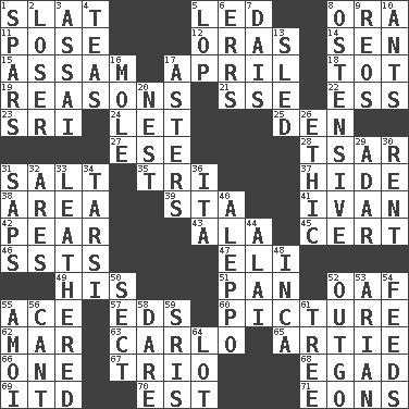 ACROSS 1. Narrow board 5. Directed 8. Mouth or opening 11. Introduce or present, as a question 12. Mouths or openings 14. Elected rep. 15. Indian state 17. Showery time 18. Small child 19. Thinks logically 21. Compass dir. 22. Curvy letter 23. Indian title of respect (Mr.) 24. Allow 25. Lair 27. Compass dir. 28. Russian ruler of old 31. Table seasoning 35. Three (prefix) 37. Flintstone garb 38. Length times width 39. R.R. building 41. _ the terrible 42. Lightbulb-shaped fruit 43. In the manner of 45. Sure thing 46. Fast planes 47. Biblical high priest 49. Part of HMS, perhaps 51. Baking dish 52. Clumsy lout 55. Adept person 57. Begley and Asner 60. Photo 62. Third mo. 63. Monte _, Las Vegas Hotel/Casino 65. Nick name for Arthur 66. Single 67. Musical group of three 68. Mild oath 69. It would 70. Eastern Standard Time (abbr.) 71. Immeasurably long periods of time DOWN 1. Practice fights 2. Failure 3. Slender Brazilian palm 4. Beverages made from leaves 5. Chop off 6. Blunders 7. Raised platform 8. Clearly or manifestly demonstrative 9. Vintage cars 10. Pismires 13. Downhill vehicle 16. Undercover agent 17. Michaelmas daisies 20. Egg locale 26. Value system 29. The sixth month of the Jewish calendar 30. Monthly bill 31. Plant excrements 32. Ancient Greek god of war 33. Tough but pliablecoriaceous 34. Tarsus (plural) 36. Call ___ day 40. City in Syria 44. Jai _ 48. South American Indian 50. Religious group 52. Money paid out 53. Believer in; advocate of (suffix) 54. Eats 55. Mine, in Marseilles 56. Patter 58. Have the gumption 59. Indian titles of respect 61. Relationship diagram 64. Car dealer's back yard