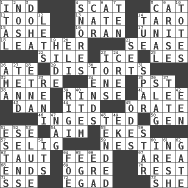ACROSS 1. Indiana (abbr.) 4. Scram, to a cat 8. Feline 11. Instrument 13. Nathan's nickname 14. Edible starchy tuberous root 15. American tennis player Robert 16. NW Algerian seaport 17. A single undivided whole 18. Cordwainer's material 21. Gospel singer Marvin 22. Filth; sediment 23. Frozen water 25. French article 26. Had dinner 29. What propaganda does 32. Distance measurement (Brit.) 34. Compass dir. 35. Pacific Standard Time (abbr.) 38. Queen of England 1702-14 39. Wash lightly 41. Toward shelter 43. Daniel's nick name 44. It would 45. Declaim 46. Eaten 50. Commissioned military rank (abbr.) 51. Compass dir. 54. Direct toward a target or goal 55. Makes supply last 57. Major League Baseball Commissioner Bud 59. Snuggling 63. Pulled tight 64. Nourish 67. Type of rug 68. Extremities 69. Legendary monster 70. Remainder 71. Compass dir. 72. Mild oath 73. A female animal or person DOWN 1. Slanted text style (abbr.) 2. Sense of smell 3. Capital of the state of Qatar 4. Sounds asleep 5. Automobile 6. _ moment's notice (2 wds.) 7. Nine, plus one 8. Lessep's creation 9. Originate 10. Hauls 12. Allows 14. Third day of the wk. 19. Flintstone garb 20. Biblical high priest 21. Put into a specified state 23. Charged particles 24. Algonquian 26. Wet nurse (var.) 27. Be inclined (to) 28. Inactive volcano in Sicily 30. Is inclined (to) 31. Practice fight 33. Painter Guido (1575-1642) 36. Volcanic refuse 37. Wig 39. Swiss mountan, "Queen of the Mountains" 40. Detail 42. Car or cant ending 45. Lyric poems 47. Tired old horse 48. Looked after 49. Supplement with great effort 51. _____ Park, CO 52. Seines 53. Evade 56. Play the lead 58. It is 60. Angers 61. Tender 62. Yard entry 64. Enemy 65. Ovum 66. Period