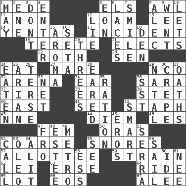 ACROSS 1. Ancient Persian 5. Raised railways 8. Leather borer 11. At once, immediately (arch.) 12. Rich soil 13. Area sheltered from the wind 14. Gossips 17. Happening 19. Cylindrical with tapered ends 21. Opts 22. Writer of Portnoy's Complaint (1969) 23. Elected rep. 24. Erode 27. Female horse 29. Non-commissioned officer (abbr.) 32. Sports stadium 34. Hearing organ 36. "Two Mules for Sister ____" 37. Hoop that covers a wheel 38. Period 39. Proofreading order 40. 90 degrees 41. Arrange properly for use 42. Staphylococcus 43. Compass dir. 44. South Vietnam president (1954) 46. French article 47. Opposite of masc. 50. Mouths or openings 52. Unrefined 55. Sounds asleep 57. One to whom something is allotted 59. Put through a sieve 62. Luau accessory 63. Celtic language 64. Travel on or in a vehicle 65. Car dealer's back yard 66. Greek goddess of the dawn 67. Toward shelter DOWN 1. Fifth month 2. Compass dir. 3. Do not 4. Keyboard key 5. A really long time 6. Shoestrings 7. Grin 8. Actor Baldwin 9. Gone 10. Allows 12. Untruth 15. Odor 16. Bristle 18. Lair 20. Threesomes 24. Ingested 25. Believer in; advocate of (suffix) 26. Laconic 28. Having ears or earlike features 29. Relating to or accompanying birth 30. Streamer paper 31. Expletives 33. Fish or hair follower 35. Food allowance for one day 36. Fast jet (abbr.) 42. Don Adams' spy role 45. Greek god of love 47. Away 48. First name in cosmetics 49. Paris' subway 51. Spanish missionary in California 52. Give a ring to 53. Margarine 54. Set down 55. Observe 56. Move on water 58. Double-curved letter 60. Binary compound 61. Born