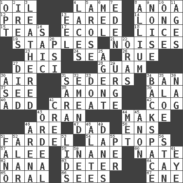 ACROSS 1. Petroleum 4. Unable to walk 8. Small Philippine buffalo 12. Before (prefix) 13. Having ears or earlike features 14. Having great length 15. Afternoon social gatherings 17. Learning spot: Fr. 18. Louse (plural) 19. Paper fasteners 21. Annoying sounds 23. Part of HMS, perhaps 24. Ocean 26. Sorrow 27. Tenth: prefix 28. Island territory of the United States 30. Atmosphere 31. Spring feasts 34. Forbid 37. Observe 38. Amid 39. Insect wing 40. Say or write further 41. Cause to be 42. Gear tooth 43. NW Algerian seaport 44. Create 46. "We ___ not amused" (Victoria) 47. Male parent 50. Followers of ems 51. Bundle 54. Portable computers 57. Toward shelter 58. Empty; void 60. Nathan's nickname 62. Nanny 63. Prevent from occurring 64. Island 65. Relating to the mouth 66. Perceives with the eye 67. Compass dir. DOWN 1. Choose 2. Angers 3. Resembling or made to resemble leather 4. Shoestrings 5. Came up 6. Cartoonist voice _ Blanc 7. Paradise 8. Plant genus of onion and garlic 9. Annoying sound 10. Single time 11. Eons 13. Snakelike fish 16. Ketch in the Levant 20. Air pressure measure (abbr.) 22. Mouths or openings 25. Representative 27. Passed on 29. Goad 30. White ___ sheet 31. "Two Mules for Sister ____" 32. Make improvements or corrections to 33. ___ good deed 34. Keyboard key 35. _ vera 36. Tired old horse 41. Algonquian 43. Severe or trying experience 44. Was introduced to 45. Soon (poet.) 46. Sports stadium 48. Having winglike extensions 49. Natives or inhabitants of Denmark 51. Papal veil 52. Having or resembling wings 53. Hats (slang) 55. For each 56. Comedian Laurel of Laurel & Hardy 59. Born 61. Sight organ