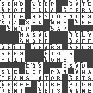 ACROSS 1. Transmit 5. Shed a tear 9. Yard entry 13. Mine, in Marseilles 14. Pulitzer Prize-winning author Ferber 15. Spanish missionary in California 16. "Death on the ____" 17. Homes 19. R.R. building 20. Elected rep. 21. Compass dir. 22. Observe 23. Clip 25. Plant excrement 26. Relating to the nose 30. Have confidence or faith in 34. Dwarf 35. Double curve, resembling the letter S 36. Stare 39. Practice fights 42. Eons 43. Observes 44. Disturbances 46. Sudden quick movement 47. Music written for nine 48. Greek goddess of the dawn 51. Son of Isaac 54. Institute legal proceedings 57. Mouth edge 58. Baking dish 60. Santa ___, CA 62. Interpreter 65. Indian titles of respect 66. Match 67. Become fatigued 68. "Silly old bear" 69. Monthly bill 70. Puts into a specified state 71. Queen of England 1702-14 DOWN 1. Without 2. Sends forth 3. Pitcher Ryan 4. Pass on 5. We are 6. Genesis locale 7. Followers of ems 8. Aches 9. Commissioned mil. rank 10. Curves 11. Family _ (genealogy) 12. Comfort 15. Ooze 18. Heredity factor (abbr.) 20. Connect, as a bridge 24. Swallow 27. Distress signal 28. Electrical Unit 29. Memorize 30. Ridicules or criticizes harshly 31. Oval reproductive body of a fowl 32. Area sheltered from the wind 33. Consenting reply 36. Order of Saint Francis (abbr.) 37. Set 38. Flowery wreath 40. _ de Janeiro 41. Male offspring 45. Adolescent 48. Otherwise 49. Petroleum 50. Arguments over trivial matters 52. Composer Copland 53. The state of being joined or united 54. Play the lead 55. Goad 56. Merit 58. Left side of a ship or aircraft 59. Ancient Greek god of war 61. American tennis player Robert 63. Fish or hair follower 64. Neckwear 65. Health resort