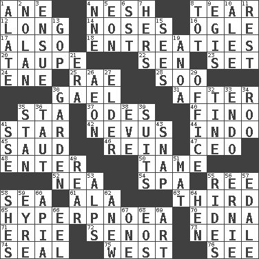 ACROSS 1. A saturated hydrocarbon 4. Soft 8. Pull apart 12. Protracted 14. Olfactory organs 16. Stare 17. In addition 18. Pleas 20. Grayish beige 22. Elected rep. 23. Arrange properly for use 24. Compass dir. 25. Actress Charlotte 28. "Barney Miller" actor Jack 30. Highlander 31. Following 35. R.R. building 37. Lyric poems 40. A pale, very dry sherry 41. Play the lead 42. Congenital growth or mark on the skin 44. _ china 45. Saudi Arabian king (1953-1964) 46. It's straight from the horse's mouth 47. Corporate head (abbr.) 48. Keyboard key 50. Docile 52. Teachers' org. 54. Health resort 55. To separate or throw off 58. Ocean 61. Chicken ___ king 63. One of three equal parts 65. Abnormally rapid or deep breathing 70. Pulitzer Prize-winning author Ferber 71. One of the Great Lakes 72. Sir (Sp.) 73. Famous astronaut Armstrong 74. Lick closed 75. Compass direction 76. Perceive with the eye DOWN 1. Having winglike extensions 2. Pitcher Ryan 3. Take place subsequently 4. Compass dir. 5. A really long time 6. Fast jet (abbr.) 7. Possessive pronoun 8. Small child 9. The front part of a cuirass 10. Toward shelter 11. Relief 13. Republican Party 15. Perceives with the eye 19. Small Philippine buffalo 21. Epoch 26. Period of immesurable duration 27. A person who is older than you are 29. Place of business 30. Place where plants grow 32. Prong on a fork 33. Inside; within (prefix) 34. Friend of Pooh 35. Comedian Laurel of Laurel & Hardy 36. Tense 38. First lady 39. Sets or collections 41. Compass dir. 43. Fastener 49. Stern 51. Floor covering 53. High mountains 55. Amusement-park features 56. Bert's buddy 57. Peak District village in England 58. "______ My Girl" (Turtles hit) 59. Jane of fiction 60. Capital of Western Samoa 62. Afresh 64. Layer 66. Snakelike fish 67. Single 68. Greek goddess of the dawn 69. Nonscientific branch of learning
