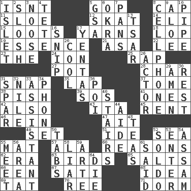 ACROSS 1. Is not 5. Republican Party 8. Head covering 11. A type of plum 12. Three-handed card game 14. Connecticut Ivy Leaguer 15. Plunders 17. Tall tales 18. Trim (branches) 19. Center 21. White ___ sheet 22. Area sheltered from the wind 23. Definite Article 24. Electrically charged atom 25. Strike 27. Plant holder 28. Burn to charcoal 31. Fastener 35. Pet locale 37. Heavy book 38. Expression of disdain 39. Distress signal 41. Washington bills 42. In addition 43. Call ___ day 45. Monthly bill 46. It's straight from the horse's mouth 47. Small island 49. Put into a specified state 51. Binary compound 52. Ocean 55. Floor protector 57. Wing 60. Thinks logically 62. Period 63. Avian creatures 65. Table seasonings 66. Car or cant ending 67. Suttee (variant) 68. The content of cognition 69. Make lace 70. Portuguese money of account (variant) 71. Dormintory (informal) DOWN 1. Small island 2. Make a splashing sound 3. Trap for birds or small mammals 4. Wig 5. Girls' org. (abbr.) 6. Gumbo ingredient 7. Zero-star reviews 8. Portable communications device 9. Medicinal plant 10. Corncob 13. Russian ruler of old 16. Clip 17. Gossips 20. Calm and collected 26. Thespian 29. So be it 30. Take ten 31. Coast Guard woman 32. Mediterranean tributary 33. Aide 34. Give a jingle 36. Luau course 40. Flight of steps 44. Assistant 48. Beverages made from leaves 50. Bar bills 52. Twentieth part of a lira 53. Keyboard key 54. Indian state 55. Rendezvous 56. Length times width 58. One who doesn't tell the truth 59. Johnson of "Laugh-In" 61. Expressed in words 64. Expire