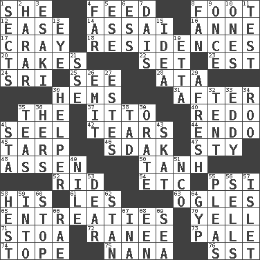 ACROSS 1. A female animal or person 4. Nourish 8. Lowest support of a structure 12. Relaxation 14. Slender Brazilian palm 16. Singer Murray 17. Supercomputer manufacturer 18. Dwellings 20. Proceeds 22. Put into a specified state 23. Eastern Standard Time (abbr.) 24. Indian title of respect (Mr.) 25. Perceive with the eye 28. "One Day ___ Time" 30. Cloth borders 31. Following 35. Definite Article 37. "Tell ____ the Marines!" 40. Do over again 41. Stitch closed the eyes of (a falcon) 42. Separates forcefully 44. Inside; within (prefix) 45. Canvas cover 46. Neighbor of Neb. 47. Filthy place 48. NE Netherlands city 50. Hyperbolic tangent 52. To free from 54. And so on (abbr.) 55. Air pressure measure (abbr.) 58. Part of HMS, perhaps 61. French article 63. Stares 65. Pleas 70. Shout 71. Portico 72. Indian princess (variant) 73. Light colored 74. Drink excessively 75. Grandmother 76. Fast jet (abbr.) DOWN 1. Religious groups 2. Ethiopian city, capital of Harari 3. 1973 Nobel Price Winner (Physics) Leo 4. Distant 5. Compass dir. 6. Double-curved letter 7. Raised platform 8. Air blower 9. Single time 10. Washington bills 11. Trial 13. Sight organ 15. The content of cognition 19. Singer James 21. Compass dir. 26. Give off 27. _____ Park, CO 29. Anew 30. Aide 32. Portable shelter 33. Whirlpool 34. Friend of Pooh 35. Afternoon social gatherings 36. Possessive pronoun 38. Bit 39. Declaim 41. R.R. building 43. Three-handed card game 49. "Death on the ____" 51. Non-commissioned officer (abbr.) 53. Letter starter 55. Entreaties 56. Makes a sale 57. Small island 58. Behest 59. To the inside or interior of 60. Close up, plug up 62. Comedian Laurel of Laurel & Hardy 64. Hustle 66. Actress Charlotte 67. _ tizzy (2 wds.) 68. Car or cant ending 69. Ocean