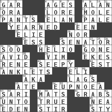 ACROSS 1. Slender fish 4. Eras 8. Actor Alda or Thicke 12. Mouth or opening 13. Old wives' tales, e.g. 14. Undercover agent 15. Leg coverings 18. Style 19. Light colored 20. Had a strong desire 22. Car or cant ending 23. Writer Wiesel 24. And not 25. Curvy letter 26. Elected representative 30. "Barney Miller" actor Jack 33. Sun: prefix 36. Went 37. Enthusiastic 39. Zeal 40. Makes supply last 41. French philosopher Descartes 42. Not well drained, as in land 44. Eastern Standard Time (abbr.) 45. Short socks 47. Connecticut Ivy Leaguer 50. Alias (abbr.) 51. Fails to keep up a pace 53. Had dinner 54. Normal relaxed breathing 57. Indian skirt 59. Floor coverings 61. Catches 63. To (old English) 64. Loyal 65. Teachers' org. 66. Paradise 67. Disorderly outburst 68. Filthy place DOWN 1. Republican Party 2. Like ___ of sunshine 3. The wife of a rajah (variant) 4. Toward shelter 5. Aureate 6. Period 7. Elected rep. 8. Electrical Measurement 9. Grant temporary use of 10. Everything 11. Born 16. Lie 17. Indian titles of respect 21. Delicate 22. Period of immesurable duration 24. Modern: prefix 26. Simple or foolish person 27. Casino tip 28. Singles 29. State of inaction 30. "Two Mules for Sister ____" 31. Baking chamber 32. Pig sound 34. Nights before holidays 35. Untruth 38. Accusation by an informer 42. R.R. building 43. Sharp bark 46. Make supply last 48. Long (Scottish) 49. Composer Stravinsky 52. Seines 53. Johnson of "Laugh-In" 54. Needle case 55. One who uses or employs something 56. Collude with 57. Take to court 58. Plus 59. Mountains (abbr.) 60. Tate display 62. Declare