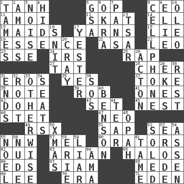 ACROSS 1. Hyperbolic tangent 5. Grand Old Party 8. Corporate head (abbr.) 11. Mine, in Marseilles 12. Three-handed card game 14. Pipe bend 15. Women servants 17. Tall tales 18. Falsehood 19. Center 21. White ___ sheet 22. Lion 23. Compass dir. 24. Big collection agency 25. Strike 27. Make lace 28. "Mermaids" star 31. Greek god of love 35. Consenting reply 37. Puff or smoke 38. Make mention of 39. Director Reiner 41. Singles 42. Capital of the state of Qatar 43. Put into a specified state 45. A home for chicks 46. Proofreading order 47. Modern: prefix 49. Acura sports coupe 51. Plant excrement 52. Ocean 55. Compass dir. 57. Cartoonist voice _ Blanc 60. Speakers 62. Fr. "Yes" 63. Believer in; advocate of (suffix) 65. Rings 66. Begley and Asner 67. Thailand, formerly 68. Ancient Persian 69. Area sheltered from the wind 70. Period 71. Genesis locale DOWN 1. Corrects by punishment or discipline 2. Collect or gather 3. Annoying sound 4. Flintstone garb 5. Girls' org. (abbr.) 6. Gumbo ingredient 7. Zero-star reviews 8. Portable communications device 9. Writer Wiesel 10. Margarine 13. Russian ruler of old 16. In a ____ (agitated or irritated) 17. Next before 20. Supercomputer manufacturer 26. 13-14th century defensive garment 29. Supplements with great effort 30. Relief 31. Extremities 32. Carrot, for example 33. Else 34. Theater features 36. Distress signal 40. Gillaume's butler role 44. Rend 48. Brightly colored fish 50. Dec. holiday 52. Having a sole or soles 53. Wear away 54. NE Netherlands city 55. Christmas carol 56. Unadorned 58. One of the Great Lakes 59. One who doesn't tell the truth 61. Not wild 64. Nursemaid (var.)