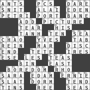 ACROSS 1. Pismires 5. Personal Computers (abbr.) 8. Have the gumption 12. In a ____ (agitated or irritated) 13. Jai ____ 15. Locale of original sin 16. _ dish (used to culture cells) 18. Sweet dark-red dessert wine 19. Object of repulsion 20. Increase 22. Photo 24. Pull apart 26. Part of HMS, perhaps 27. Hyperbolic tangent 28. "___ Little Indians" 29. Ocean 32. US Secretary of Labor Elaine L. _ 35. Jacques Cousteau's middle name 37. Keyboard key 38. It's straight from the horse's mouth 39. Spoil 40. Compact _ 41. Conclude 42. Wig 43. Angers 44. Compass dir. 45. French article 46. Afternoon social gatherings 49. Storage container 50. 90 degrees 51. Mood resulting from idleness 55. 17th letter of the Greek alphabet 56. "Two Mules for Sister ____" 57. Dutch treat 59. Bert's buddy 63. Narrow board 64. Dormintory (informal) 65. Look after 66. Canisters 67. To separate or throw off 68. Oceans DOWN 1. Cleo's killer 2. Compass dir. 3. Teat (slang) 4. Ski resort town in Vermont 5. Infant food 6. Hoof sound 7. Indian skirt 8. To get out of a bus 9. The sixth month of the Jewish calendar 10. French philosopher Descartes 11. Compass dir. 14. Skin irritations 17. It may be bright or harebrained 21. One of the 12 tribes of Israel 23. Shallow baking pan 25. Poems 28. Cylindrical with tapered ends 29. Tumult 30. Comfort 31. Lettered men learn these first 32. Algonquian 33. Coop moms 34. Helper 36. Large container 40. What propaganda does 42. Looked after 45. Whopper 47. Hearing organ 48. American tennis player Robert 49. Naughty children 51. Indonesian resort city 52. NW Algerian seaport 53. Scent 54. Female horse 56. Fast jet (abbr.) 58. Madame (abbr.) 60. Born 61. _ tizzy (2 wds.) 62. Begley and Asner