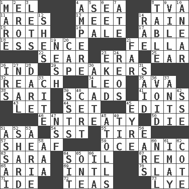 ACROSS 1. Cartoonist voice _ Blanc 4. Toward the sea 8. Federal power corp. 11. Ancient Greek god of war 13. Confront 14. Precipitation 15. Writer of Portnoy's Complaint (1969) 16. Light colored 17. Competent 18. Core 21. Man or boy (slang) 22. Burn superficially 23. Period 25. Hearing organ 26. Working for oneself (abbr.) 29. Orators 32. Arrive at 34. Lion 35. Actress Gardner 38. Indian skirt 39. Large numbers or amounts 41. Charged particles 43. Allow 44. Put into a specified state 45. Prepares for publication 46. Plea 50. Expire 51. White ___ sheet 54. Fast jet (abbr.) 55. Become fatigued 57. Archer's quiver 59. Pertaining to the sea 63. "Two Mules for Sister ____" 64. Land 67. San ____ (Riviera town) 68. Roberta Peters solo 69. International (abbr.) 70. Narrow board 71. Binary compound 72. Afternoon social gatherings 73. Sodium hydroxide DOWN 1. Female horse 2. Greek god of love 3. Allows 4. Electrical Unit 5. Ocean 6. Snakelike fish 7. Had dinner 8. Eating place 9. Country residence 10. Approach 12. "______ My Girl" (Turtles hit) 14. Actress Charlotte 19. Soft 20. Head covering 21. At a great distance 23. Supplemented with great effort 24. Vintage cars 26. Big collection agency 27. Be tempered by heat 28. Have the gumption 30. Having winglike extensions 31. Stated 33. Quote 36. State of nonexistence 37. Against 39. Fast planes 40. Certainty 42. Compass dir. 45. Jane of fiction 47. Science/research agcy. 48. Ringlike coral islands and reefs 49. Nervous spasm 51. Slender Brazilian palm 52. Pottery fragment 53. Nest on high 56. Hearing organs 58. American Automobile Association (abbr.) 60. 1994 drama film starring Jodie Foster 61. "If ____ say so..." 62. ____ d'Azur (French Riviera) 64. Be seated 65. Single 66. Call ___ day