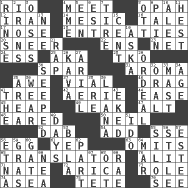ACROSS 1. River (Sp.) 4. Confront 8. Brightly colored fish 12. SW Asia republic 14. Mesonic 16. Falsehood 17. Olfactory organ 18. Pleas 20. Contemptuous expression 22. Followers of ems 23. Remaining after all deductions 24. Double-curved letter 25. Alias (abbr.) 28. Ring climax 30. Coast Guard woman 31. Scent 35. Deep reverence 37. Small bottle 40. To draw with force 41. Relationship diagram 42. Nest on high 44. Relaxation 45. Pile 46. Path through which fluid escapes 47. Keyboard modifier key 48. Having ears or earlike features 50. Famous astronaut Armstrong 52. Apply (a substance) by light strokes 54. Find the sum of 55. Compass dir. 58. Oval reproductive body of a fowl 61. Slangy assent 63. Leaves out 65. Interpreter 70. Set down 71. Nathan's nickname 72. N. Chile seaport 73. Hero or heavy, e.g. 74. At sea 75. False hair 76. Perceive with the eye DOWN 1. Remove soap 2. Metal shackles 3. Fertile tracts in a desert 4. Madame (abbr.) 5. Car or cant ending 6. Eastern Standard Time (abbr.) 7. Become fatigued 8. Baseball player Mel 9. Ache 10. Toward shelter 11. Behest 13. Born 15. Penny 19. "____ silly question..." 21. Strike 26. Polynesian shrub of the pepper family 27. Satellite of Uranus 29. Severe or trying experience 30. Oozed 32. Of the mouth 33. Vertical spar for supporting sails 34. Personal question 35. Type of rug 36. Put on (as clothing) 38. "We ___ not amused" (Victoria) 39. Woody, climbing, usually tropical plant 41. Definite Article 43. Supplemented with great effort 49. 24-hour periods 51. Wedding promise 53. Actor Lugosi 55. Grain storage towers 56. Vertical member of a panel or frame 57. First name in cosmetics 58. Inactive volcano in Sicily 59. Pate de foie ____ 60. Yard entry 62. Component 64. Third mo. 66. Teachers' org. 67. Make a knot 68. Sep. follower 69. Actress Charlotte